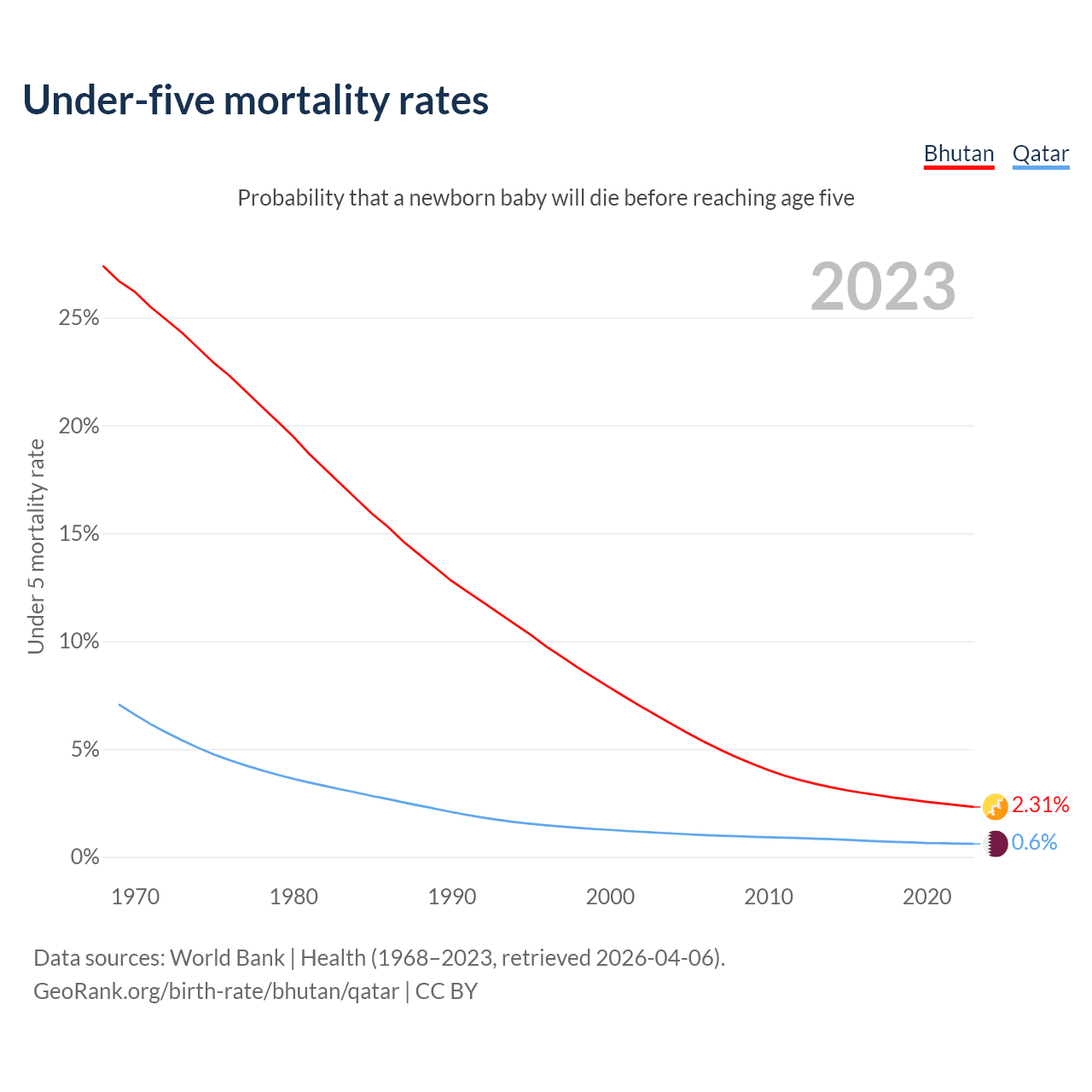 The chance that a newborn baby will die before reaching age five is 2.31% in Bhutan and 0.6% in Qatar. Above is a chart with historical data on under-five mortality rates.