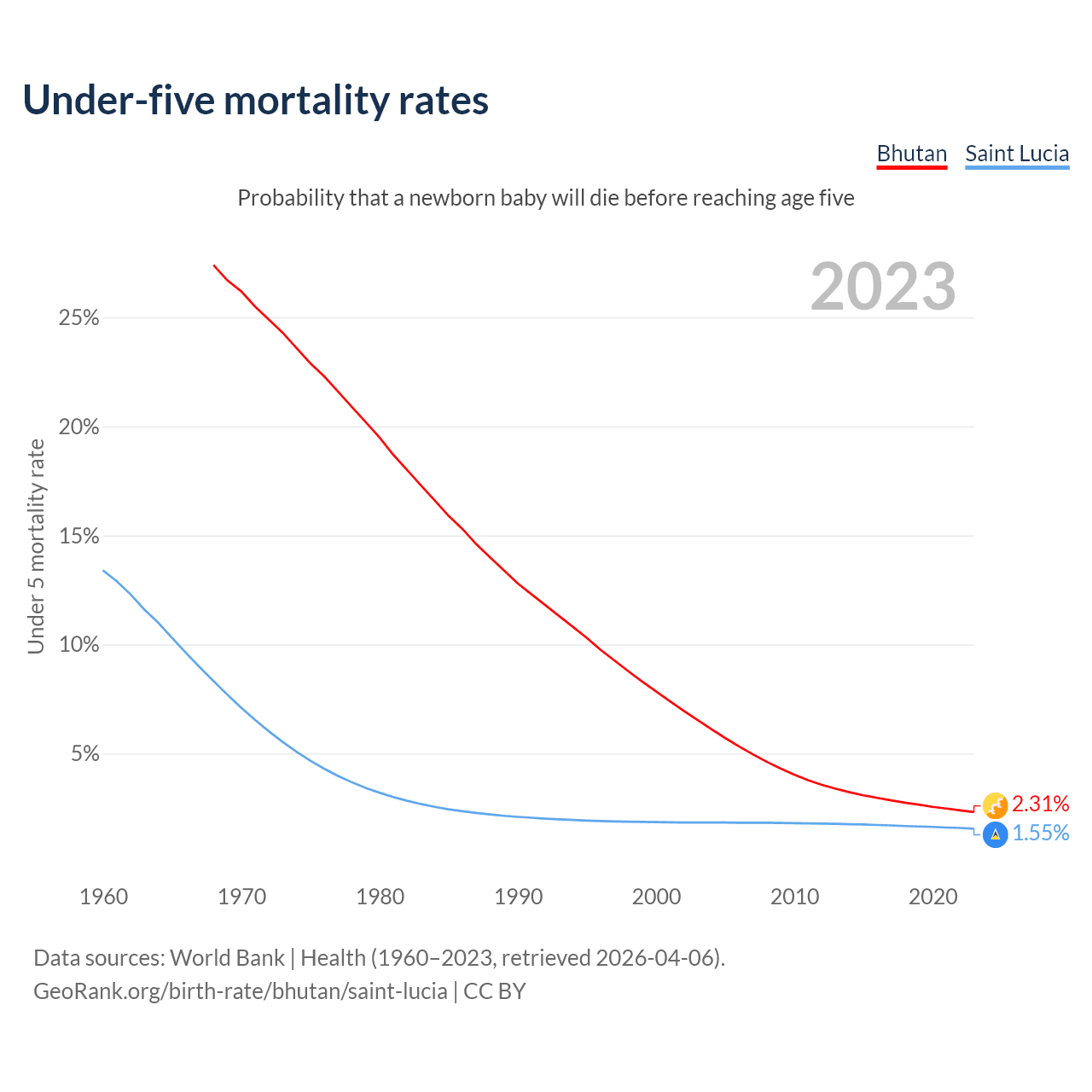 The chance that a newborn baby will die before reaching age five is 2.31% in Bhutan and 1.55% in Saint Lucia. Above is a chart with historical data on under-five mortality rates.