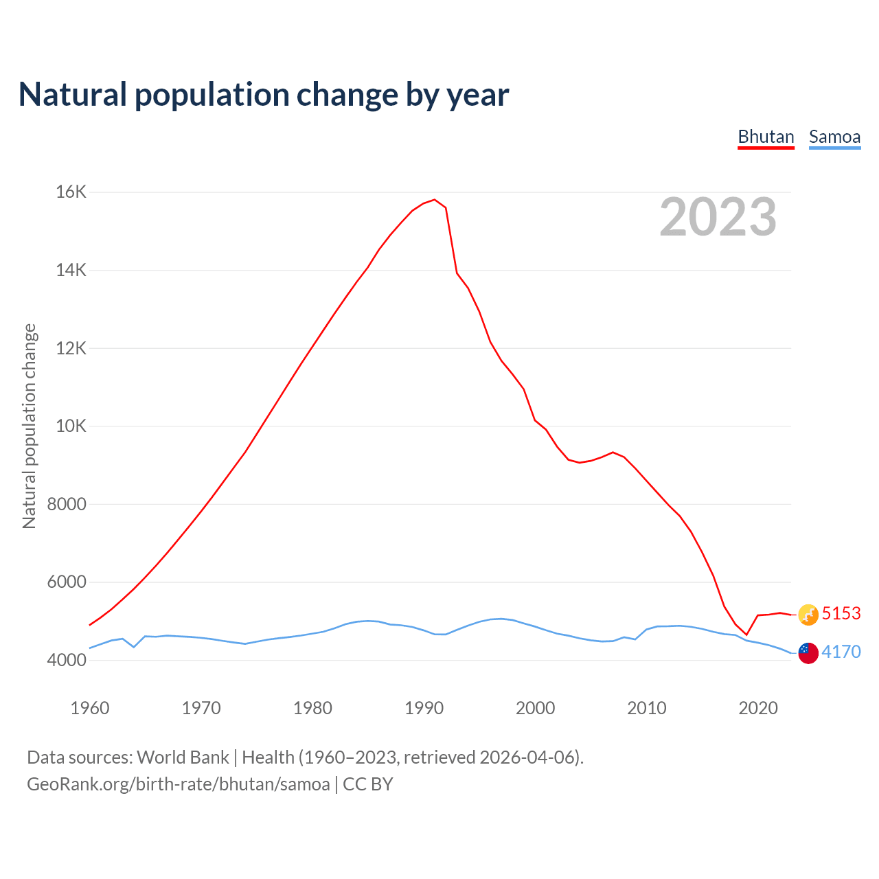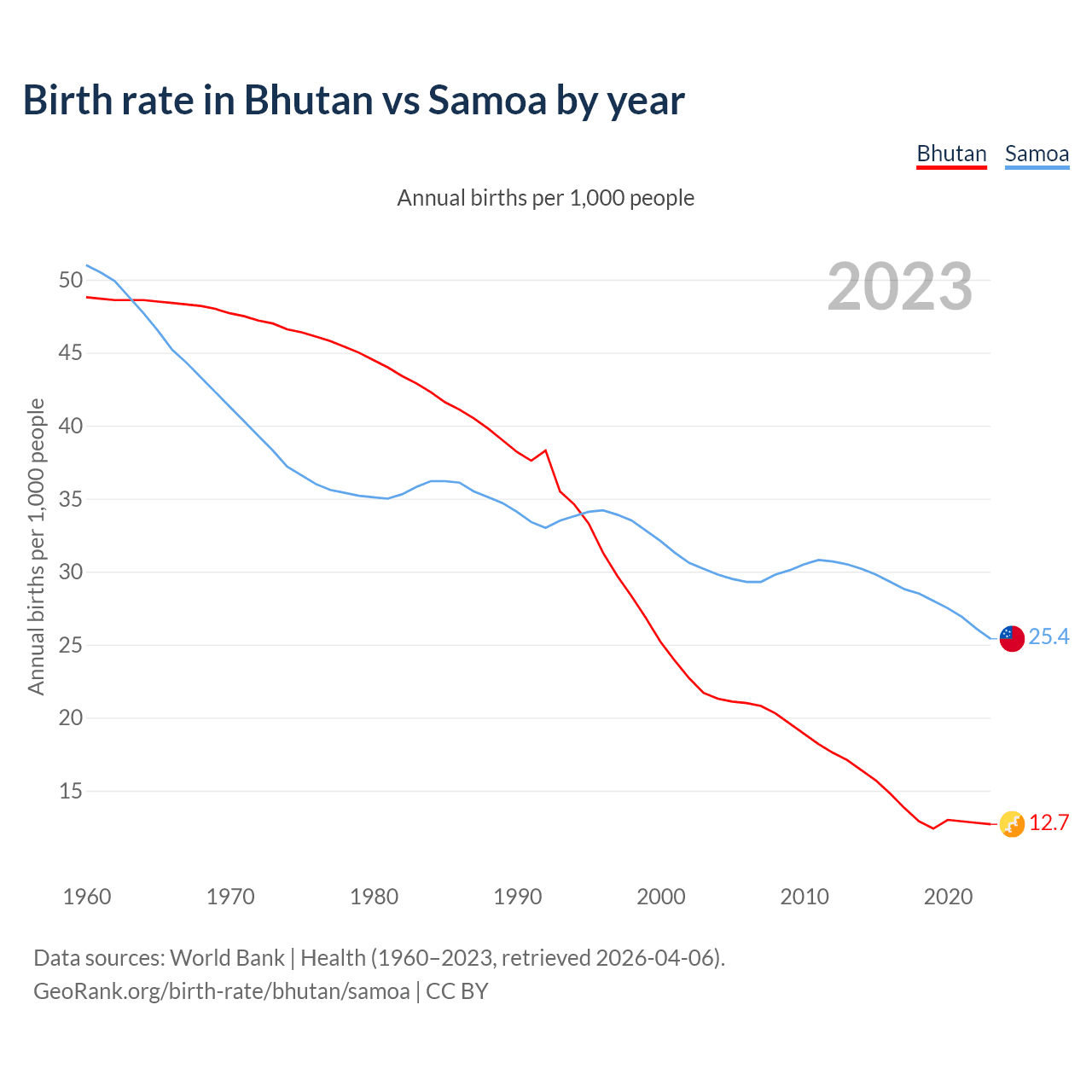 Bhutan has an annual birth rate of 12.7 births per 1,000 people, compared to 25.4 for Samoa. The average number of children a woman is expected to have during her lifetime — the fertility rate, is 1.46 in Bhutan and 3.83 in Samoa — 161.9% difference.