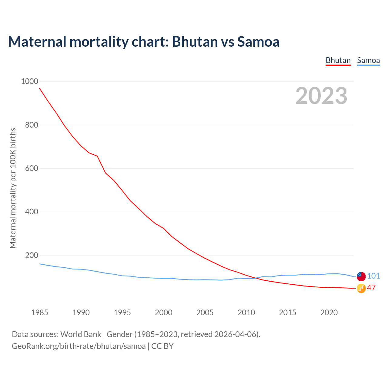 The maternal mortality rate, which is the probability of dying during childbirth or within 42 days of pregnancy termination, is 47 deaths per 100,000 live births in Bhutan, compared to 101 deaths in Samoa.