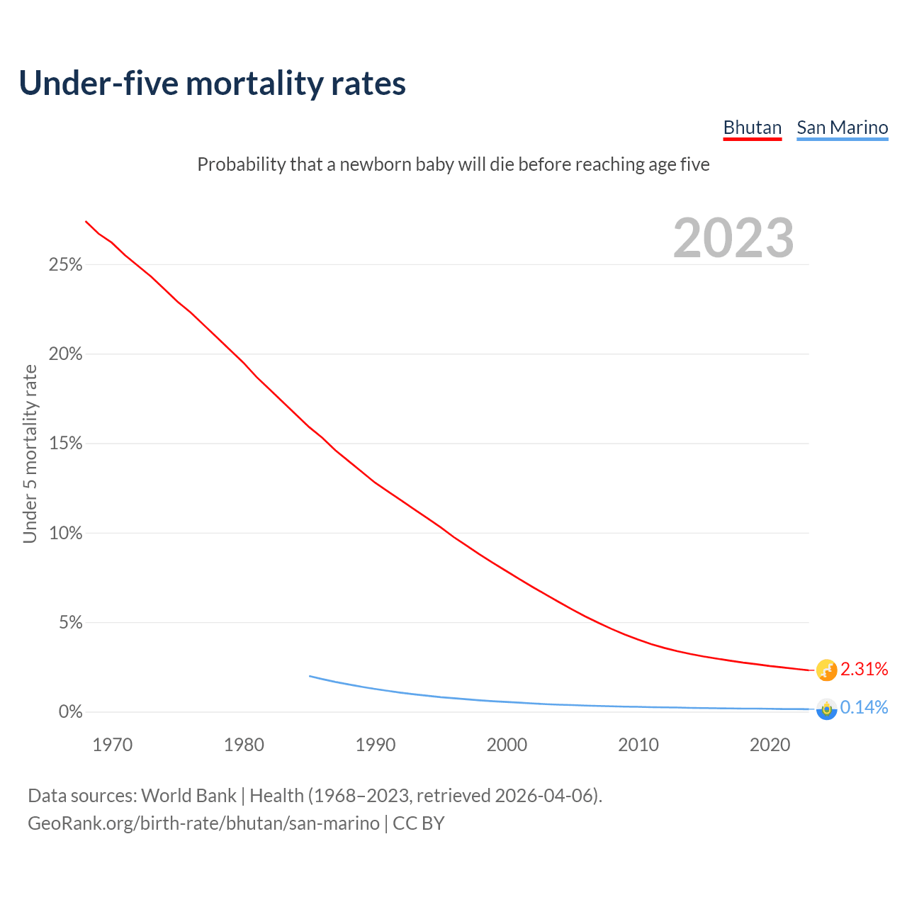 The chance that a newborn baby will die before reaching age five is 2.31% in Bhutan and 0.14% in San Marino. Above is a chart with historical data on under-five mortality rates.