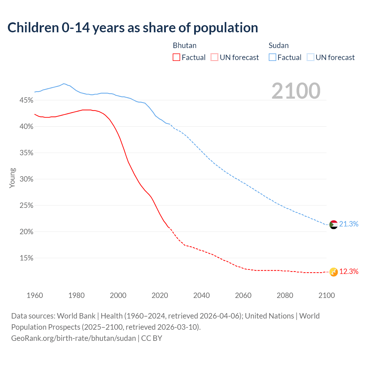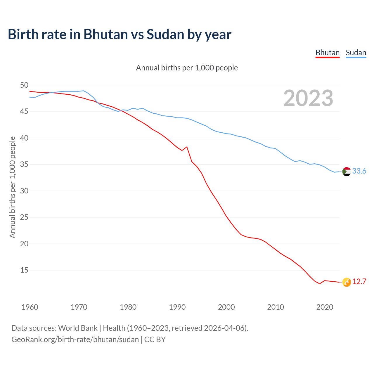 Bhutan has an annual birth rate of 12.7 births per 1,000 people, compared to 33.6 for Sudan. The average number of children a woman is expected to have during her lifetime — the fertility rate, is 1.46 in Bhutan and 4.32 in Sudan — 195.7% difference.