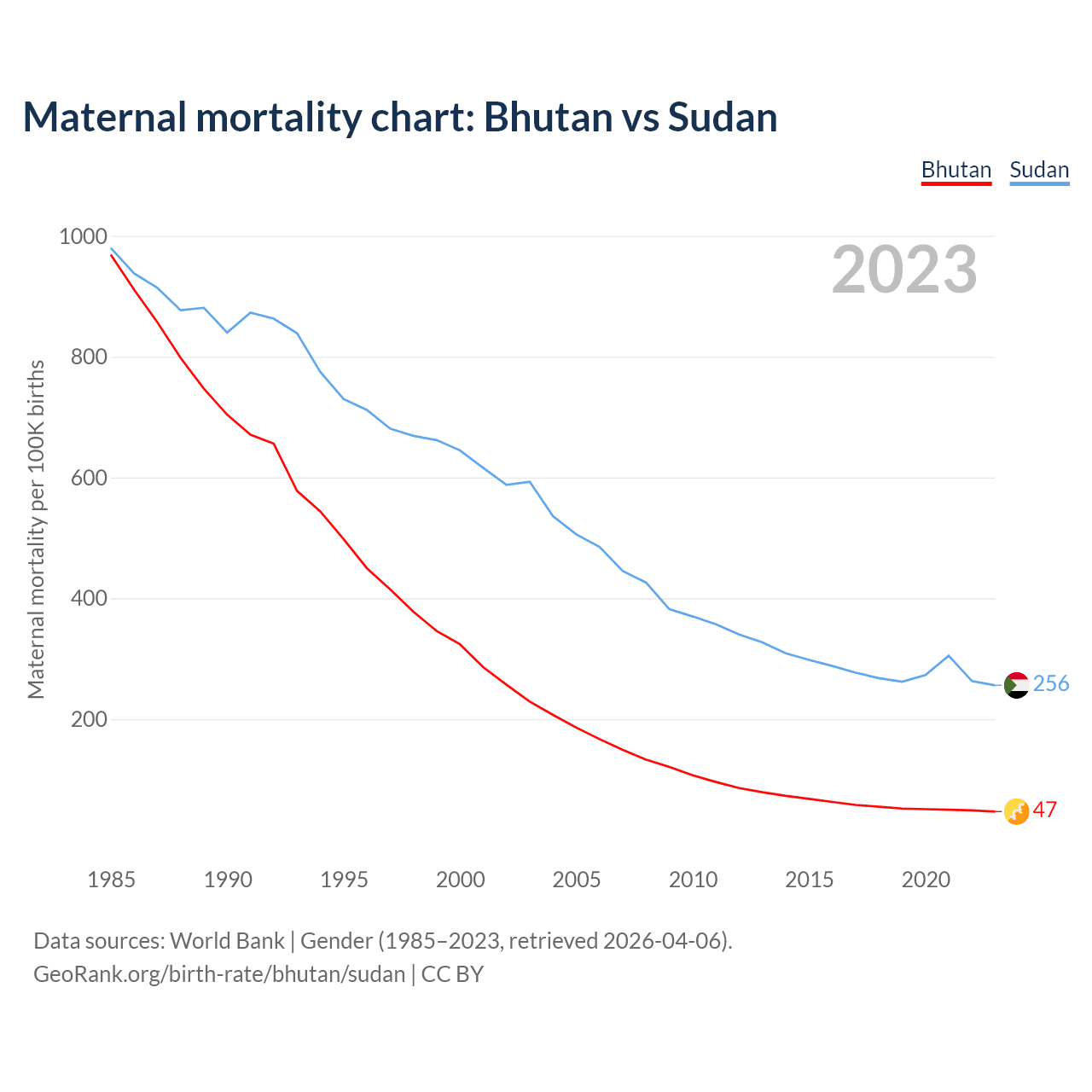 The maternal mortality rate, which is the probability of dying during childbirth or within 42 days of pregnancy termination, is 47 deaths per 100,000 live births in Bhutan, compared to 256 deaths in Sudan.