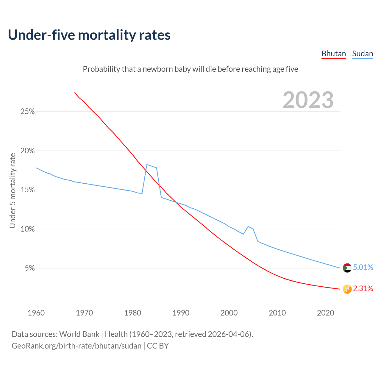 The chance that a newborn baby will die before reaching age five is 2.31% in Bhutan and 5.01% in Sudan. Above is a chart with historical data on under-five mortality rates.