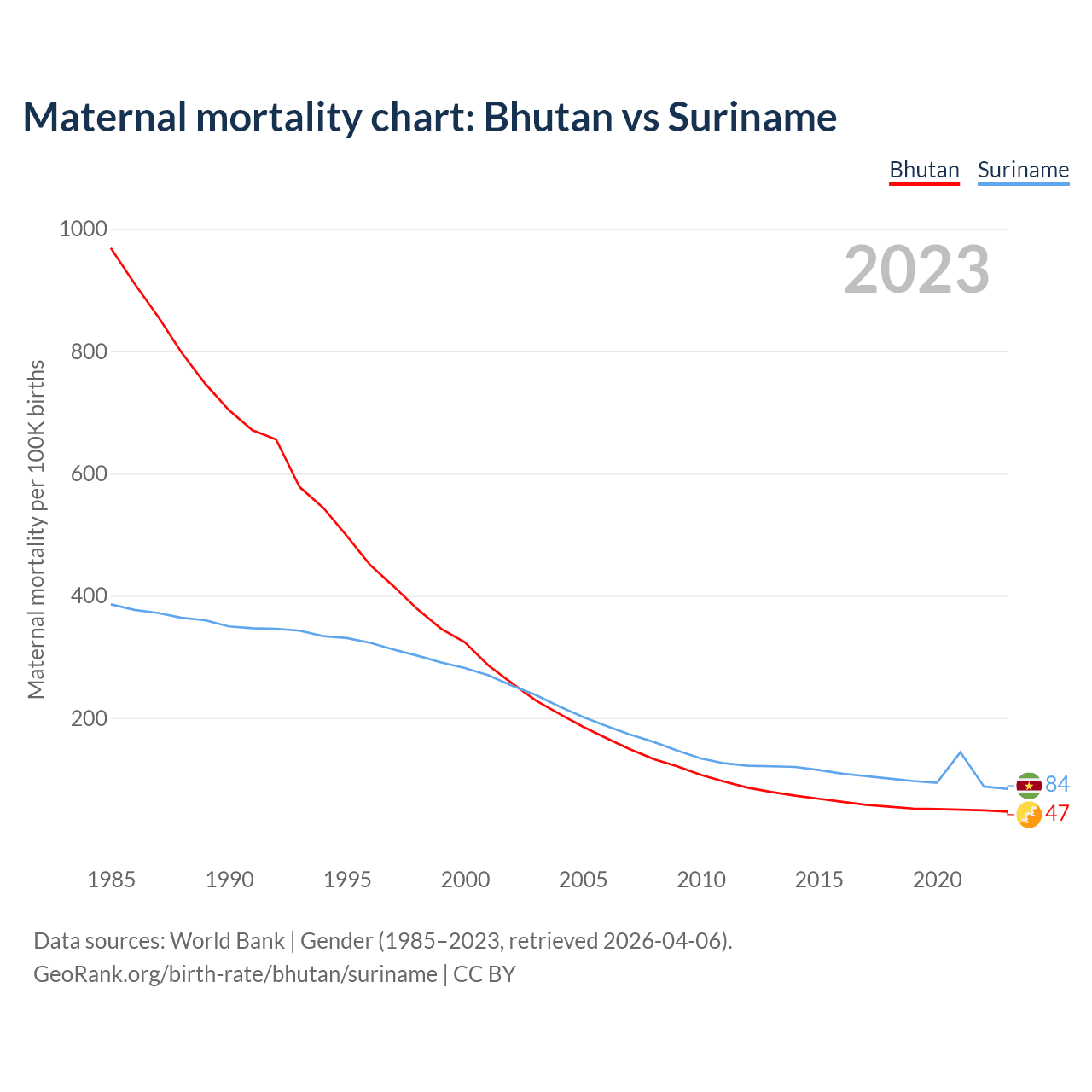 The maternal mortality rate, which is the probability of dying during childbirth or within 42 days of pregnancy termination, is 47 deaths per 100,000 live births in Bhutan, compared to 84 deaths in Suriname.
