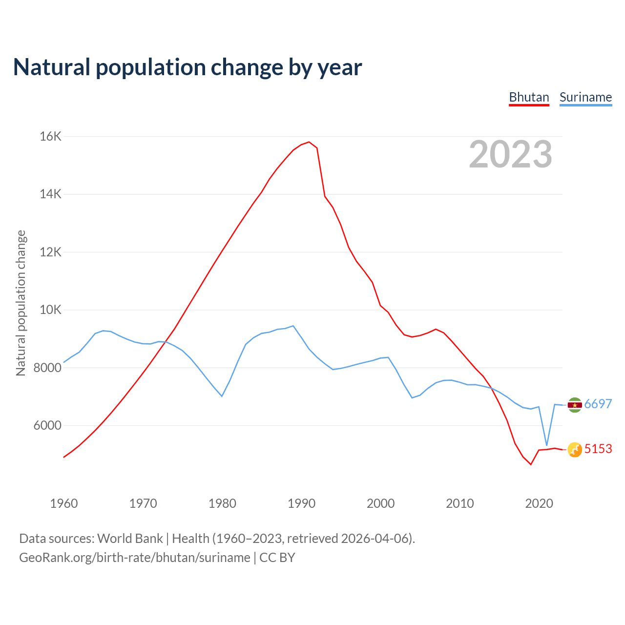 According to the latest available data on birth rates, the fertility rate in Bhutan was 1.46 children per woman in 2023, compared to 2.25 in Suriname in 2023. The replacement level is considered to be 2.1 children per woman.