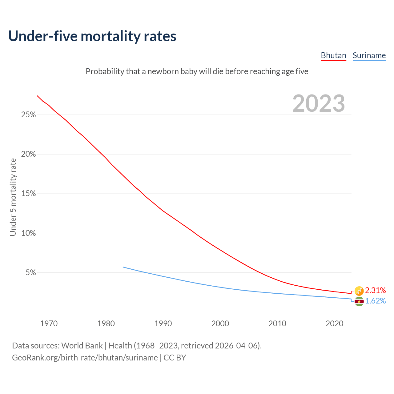 The chance that a newborn baby will die before reaching age five is 2.31% in Bhutan and 1.62% in Suriname. Above is a chart with historical data on under-five mortality rates.