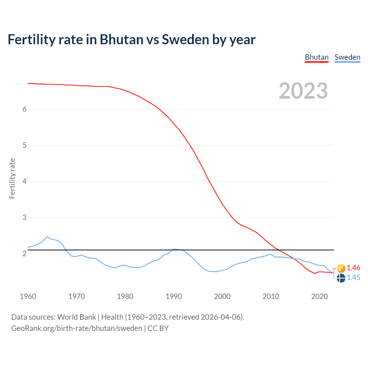 1960 vs 2023, the fertility rate has decreased by 78.2% in Bhutan and by 33.2% in Sweden — in 1960, it was 6.7 and 2.17, respectively.