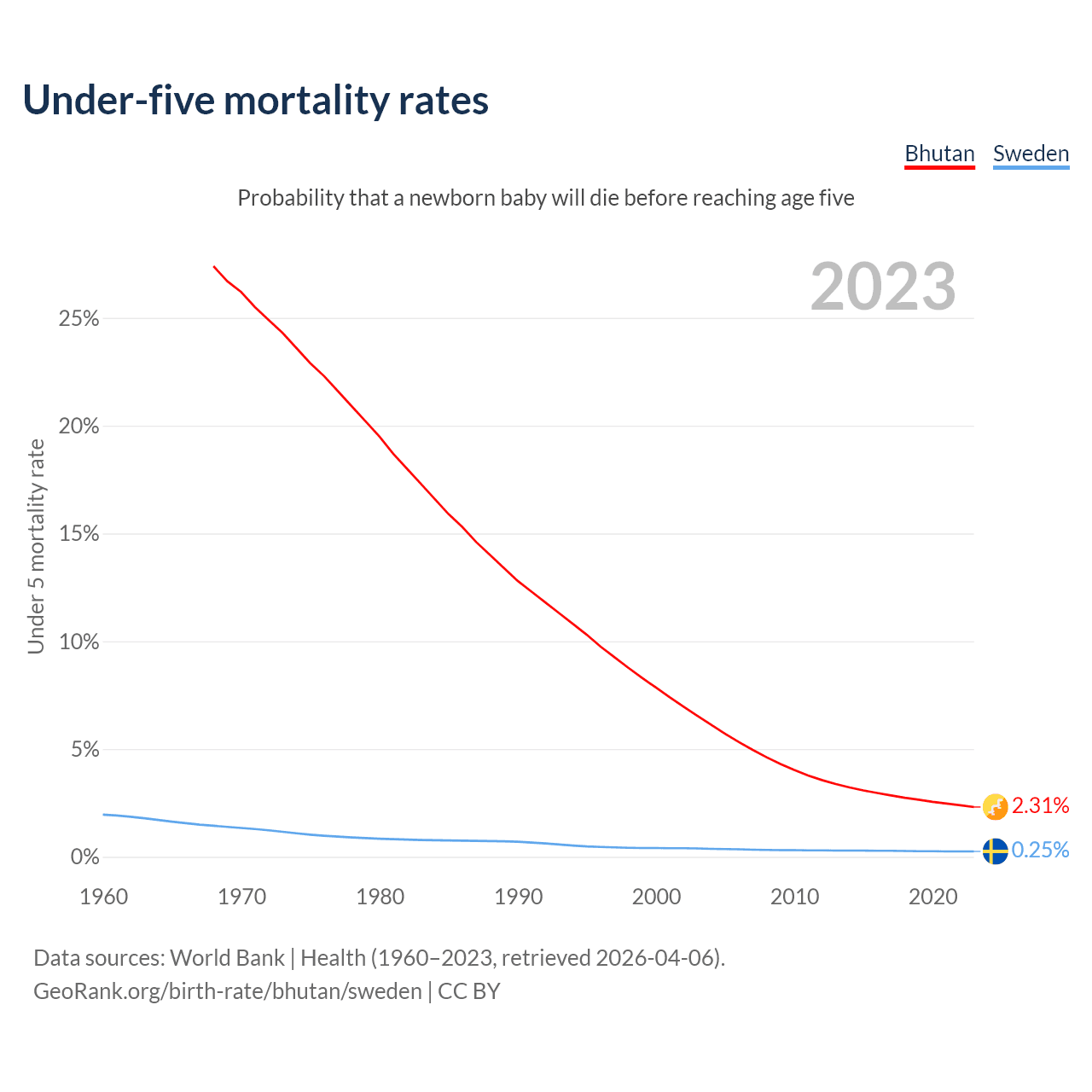 The chance that a newborn baby will die before reaching age five is 2.31% in Bhutan and 0.25% in Sweden. Above is a chart with historical data on under-five mortality rates.