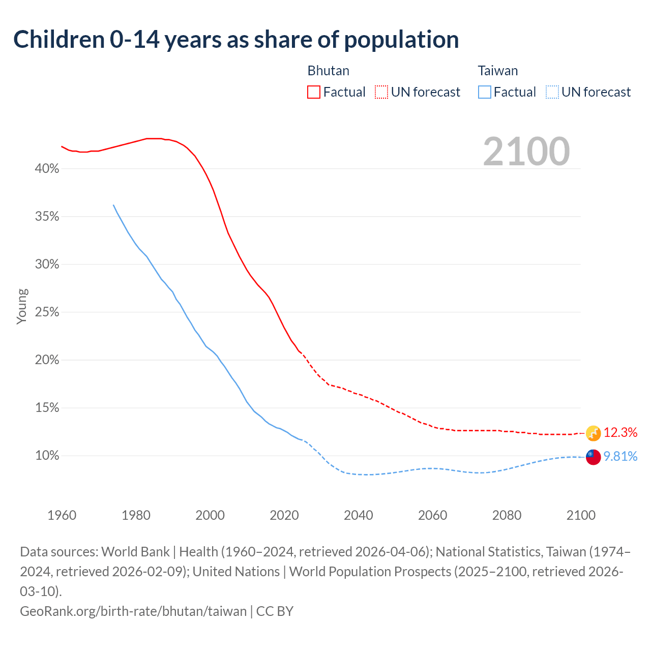 Data sources: World Bank | Health (1960–2024, retrieved 2026-04-06); National Statistics, Taiwan (1974–2024, retrieved 2026-02-09); United Nations | World Population Prospects (2025–2100, retrieved 2026-03-10).
