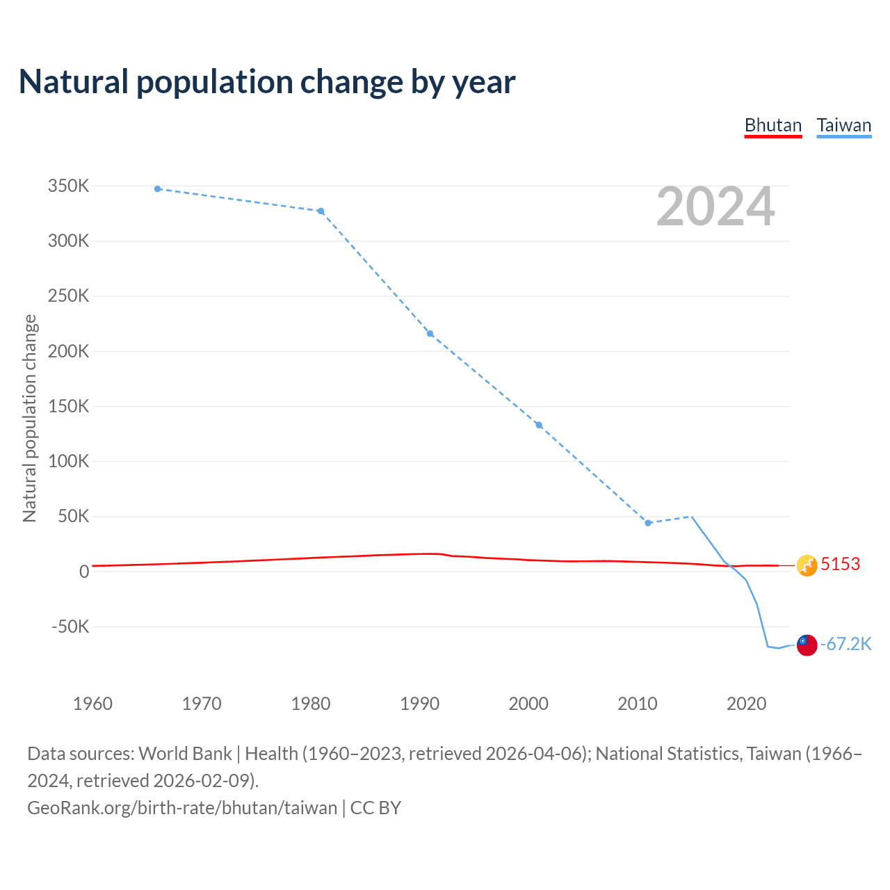Data sources: World Bank | Health (1960–2023, retrieved 2026-04-06); National Statistics, Taiwan (1951–2024, retrieved 2026-02-09).