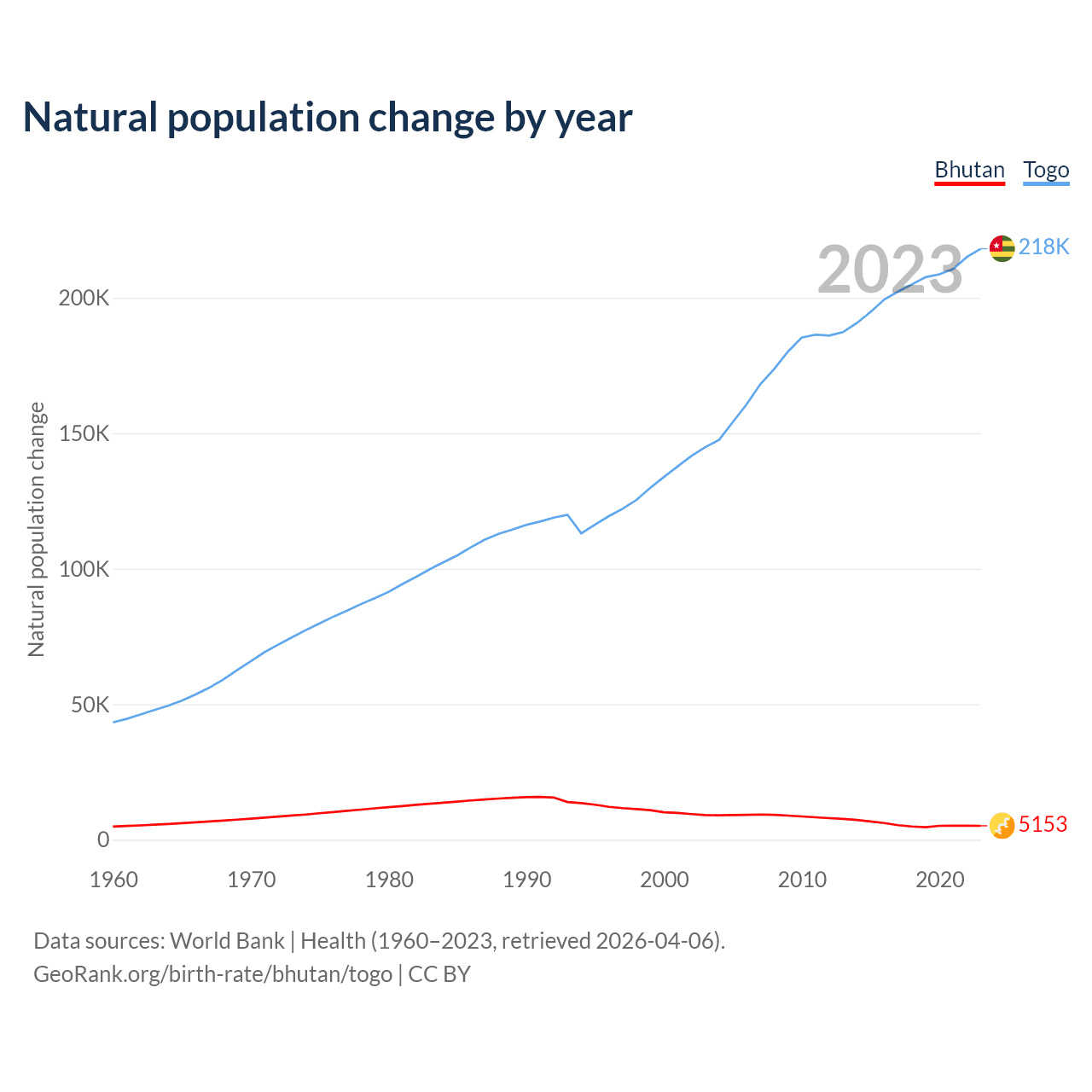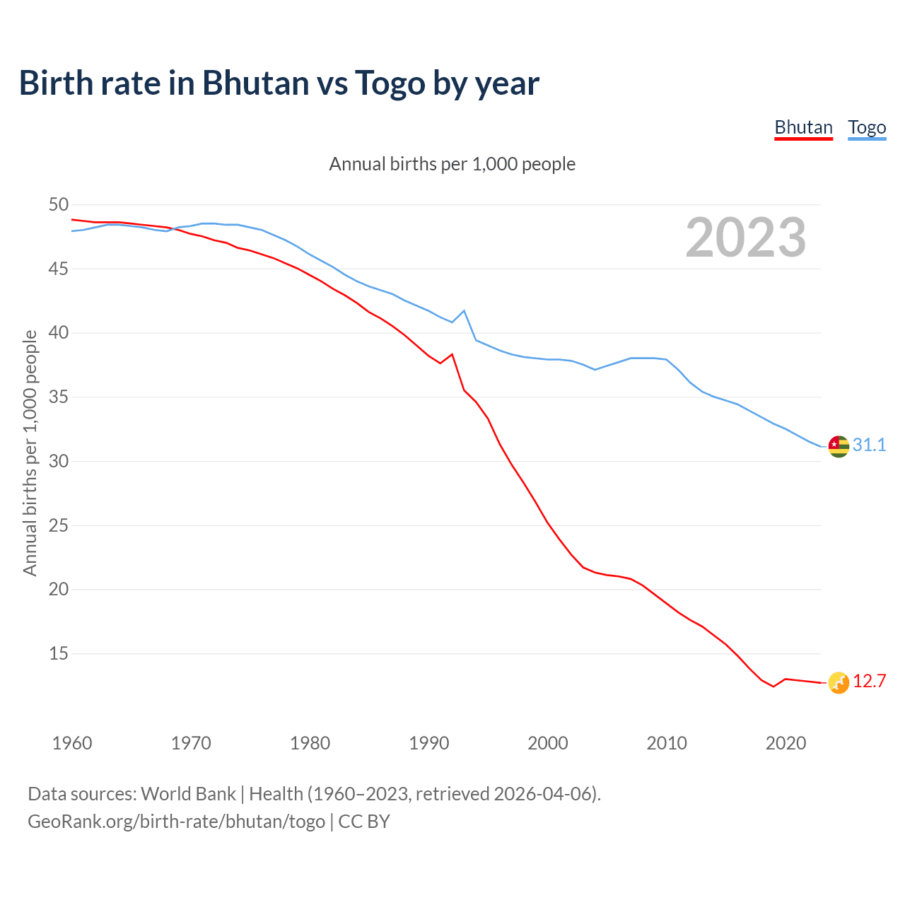 Bhutan has an annual birth rate of 12.7 births per 1,000 people, compared to 31.1 for Togo. The average number of children a woman is expected to have during her lifetime — the fertility rate, is 1.46 in Bhutan and 4.19 in Togo — 186.7% difference.