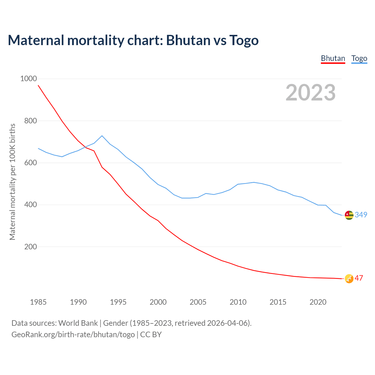 The maternal mortality rate, which is the probability of dying during childbirth or within 42 days of pregnancy termination, is 47 deaths per 100,000 live births in Bhutan, compared to 349 deaths in Togo.