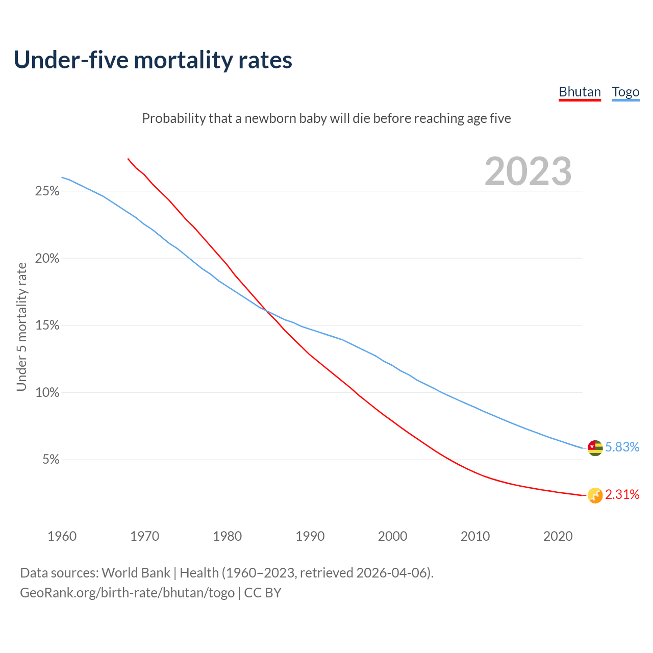 The chance that a newborn baby will die before reaching age five is 2.31% in Bhutan and 5.83% in Togo. Above is a chart with historical data on under-five mortality rates.