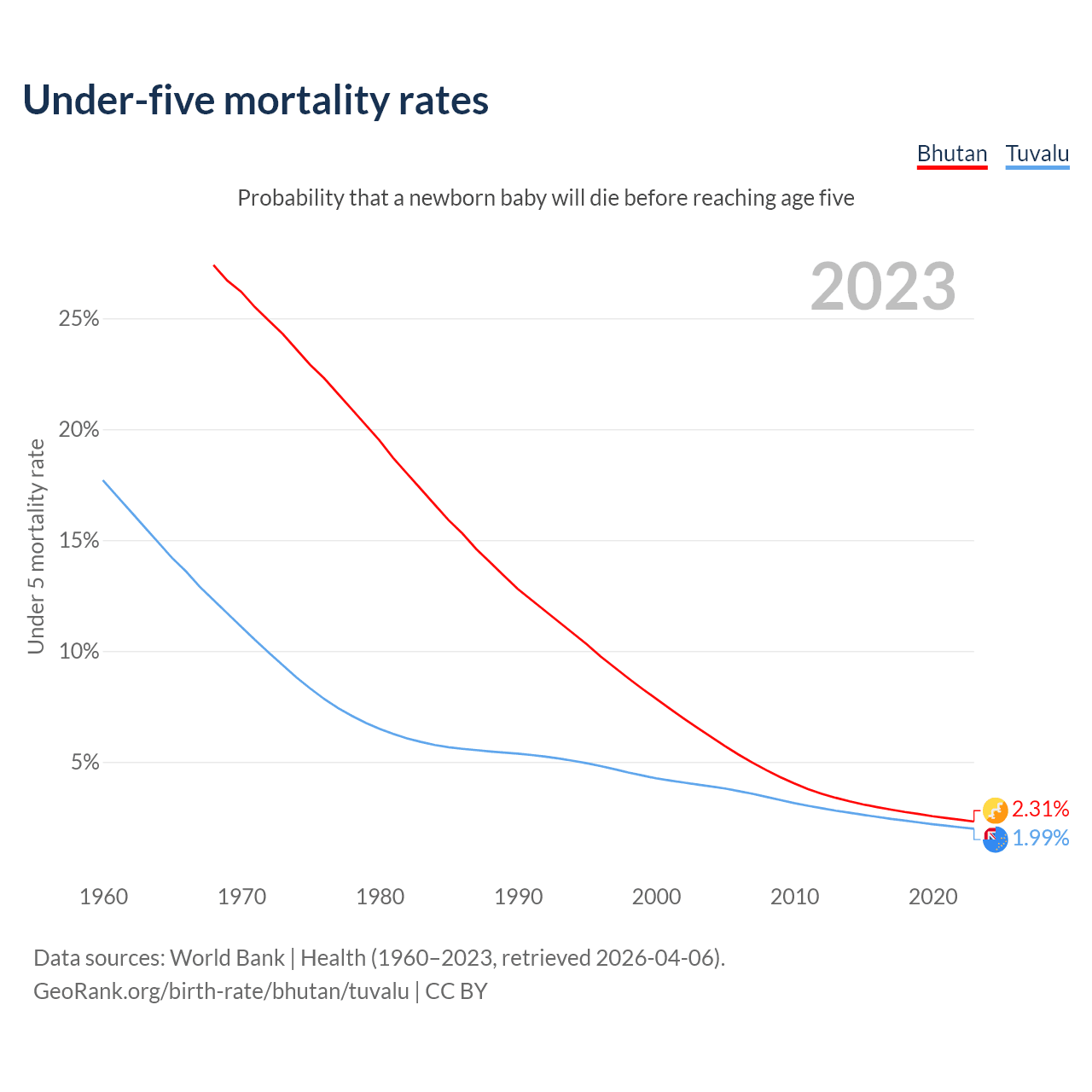 The chance that a newborn baby will die before reaching age five is 2.31% in Bhutan and 1.99% in Tuvalu. Above is a chart with historical data on under-five mortality rates.