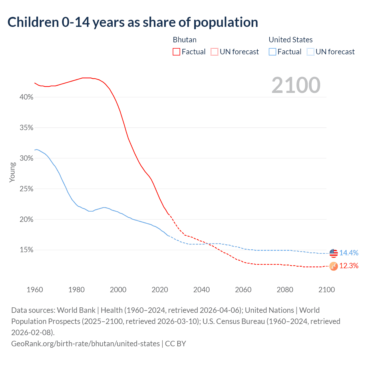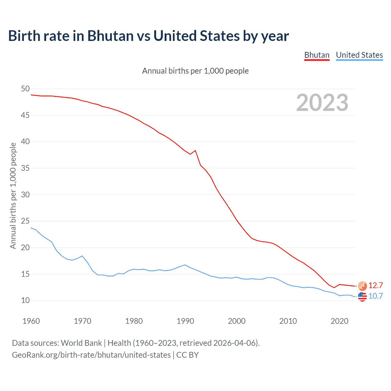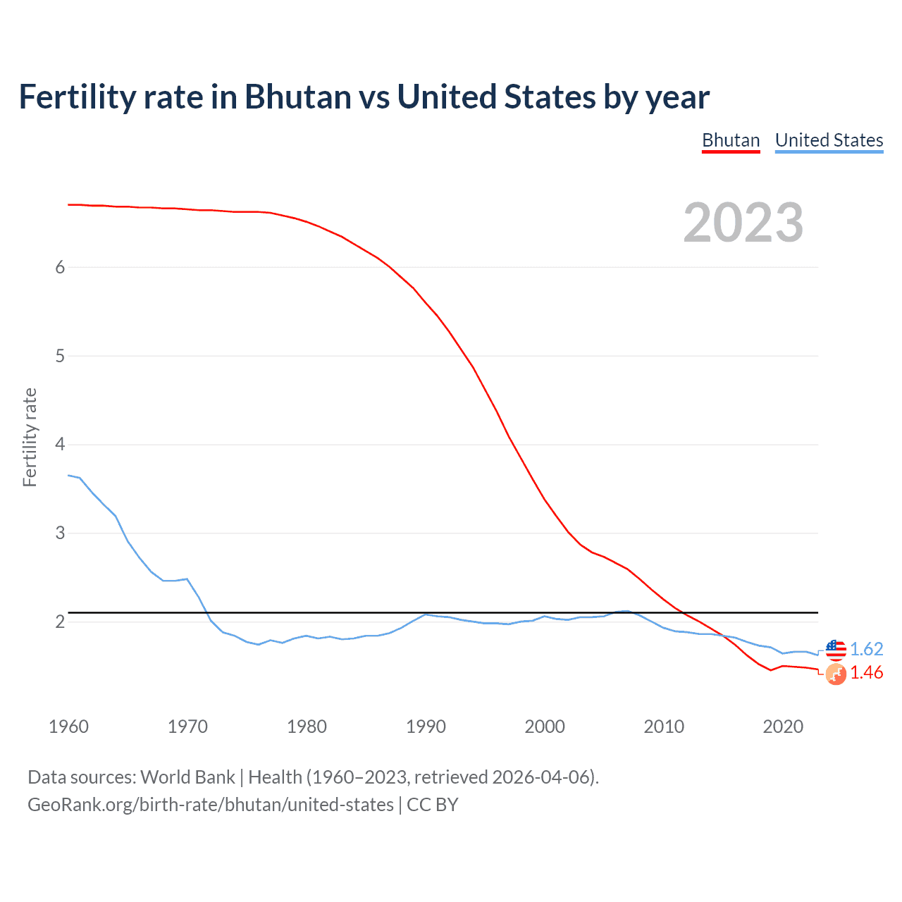 According to the latest available data on birth rates, the fertility rate in Bhutan was 1.46 children per woman in 2023, compared to 1.62 in the United States in 2023. The replacement level is considered to be 2.1 children per woman.