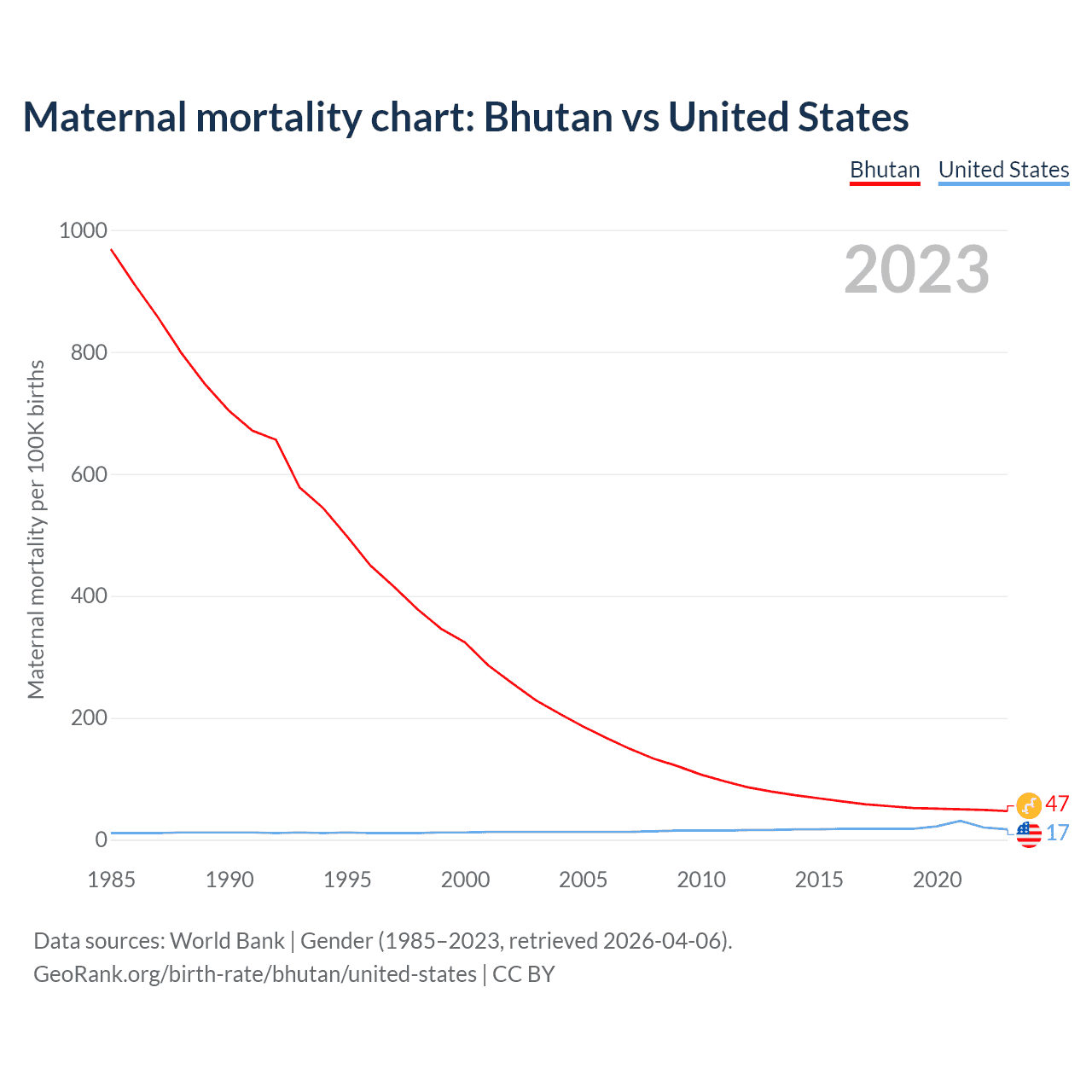 The maternal mortality rate, which is the probability of dying during childbirth or within 42 days of pregnancy termination, is 47 deaths per 100,000 live births in Bhutan, compared to 17 deaths in the United States.