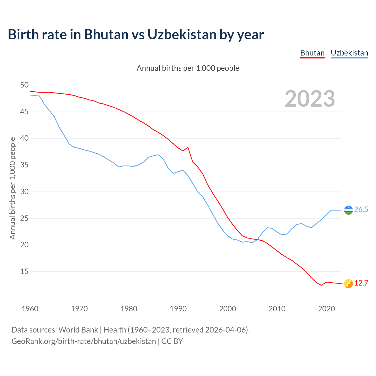 Bhutan has an annual birth rate of 12.7 births per 1,000 people, compared to 26.5 for Uzbekistan. The average number of children a woman is expected to have during her lifetime — the fertility rate, is 1.46 in Bhutan and 3.5 in Uzbekistan — 139.4% difference.
