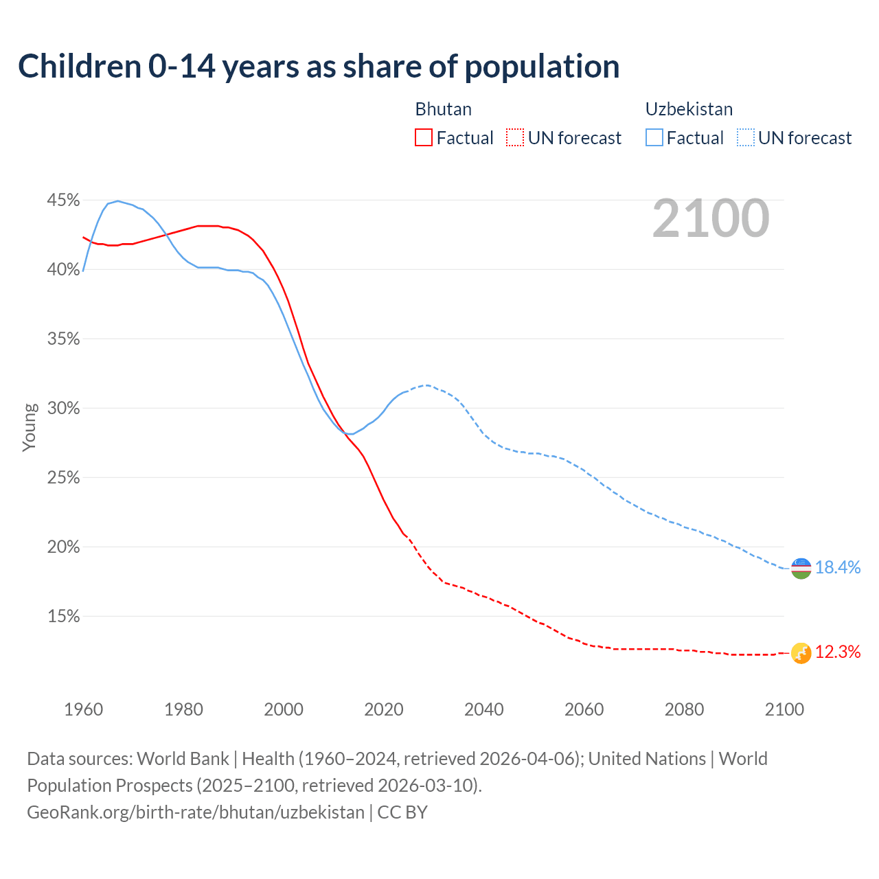 According to the latest available data on birth rates, the fertility rate in Bhutan was 1.46 children per woman in 2023, compared to 3.5 in Uzbekistan in 2023. The replacement level is considered to be 2.1 children per woman.