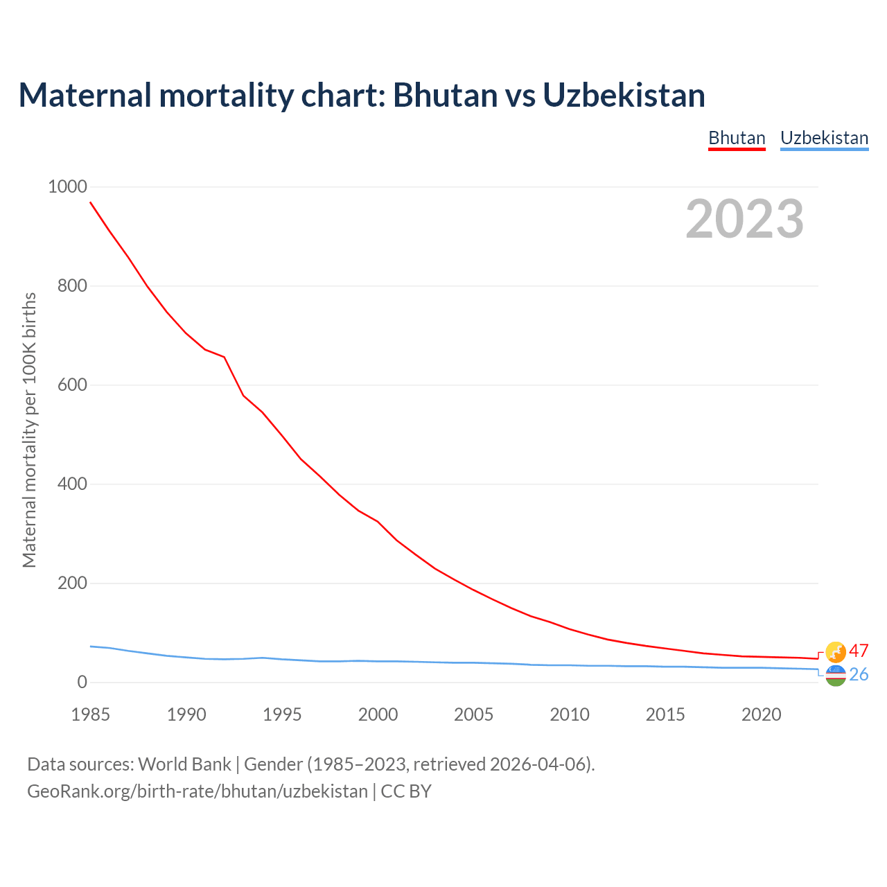 The maternal mortality rate, which is the probability of dying during childbirth or within 42 days of pregnancy termination, is 47 deaths per 100,000 live births in Bhutan, compared to 26 deaths in Uzbekistan.