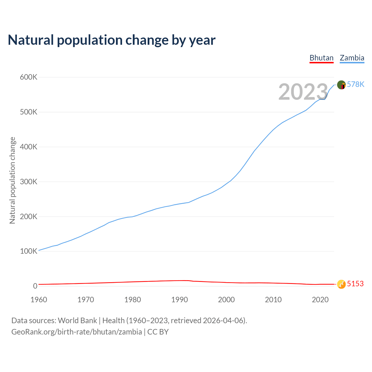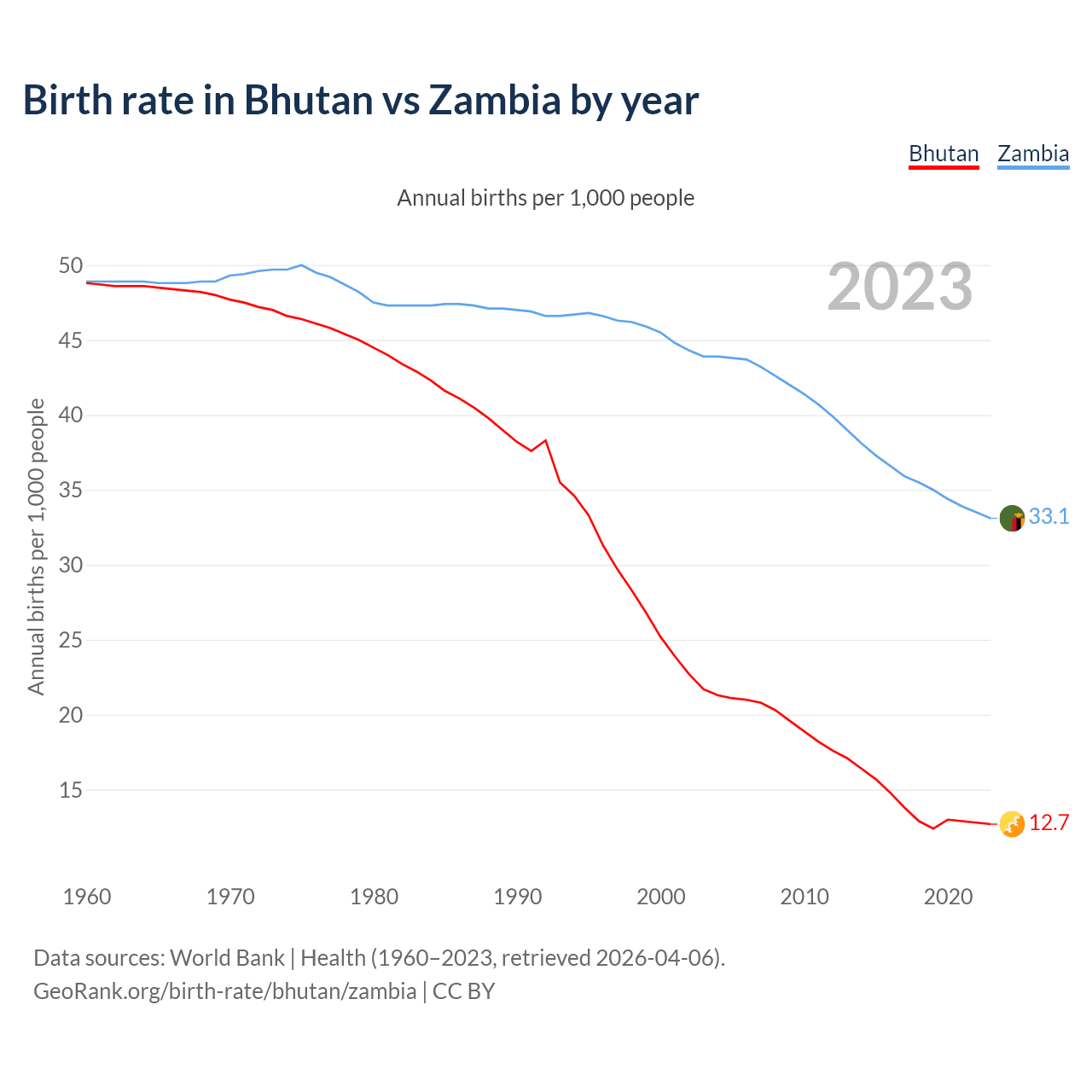 Bhutan has an annual birth rate of 12.7 births per 1,000 people, compared to 33.1 for Zambia. The average number of children a woman is expected to have during her lifetime — the fertility rate, is 1.46 in Bhutan and 4.1 in Zambia — 180.5% difference.