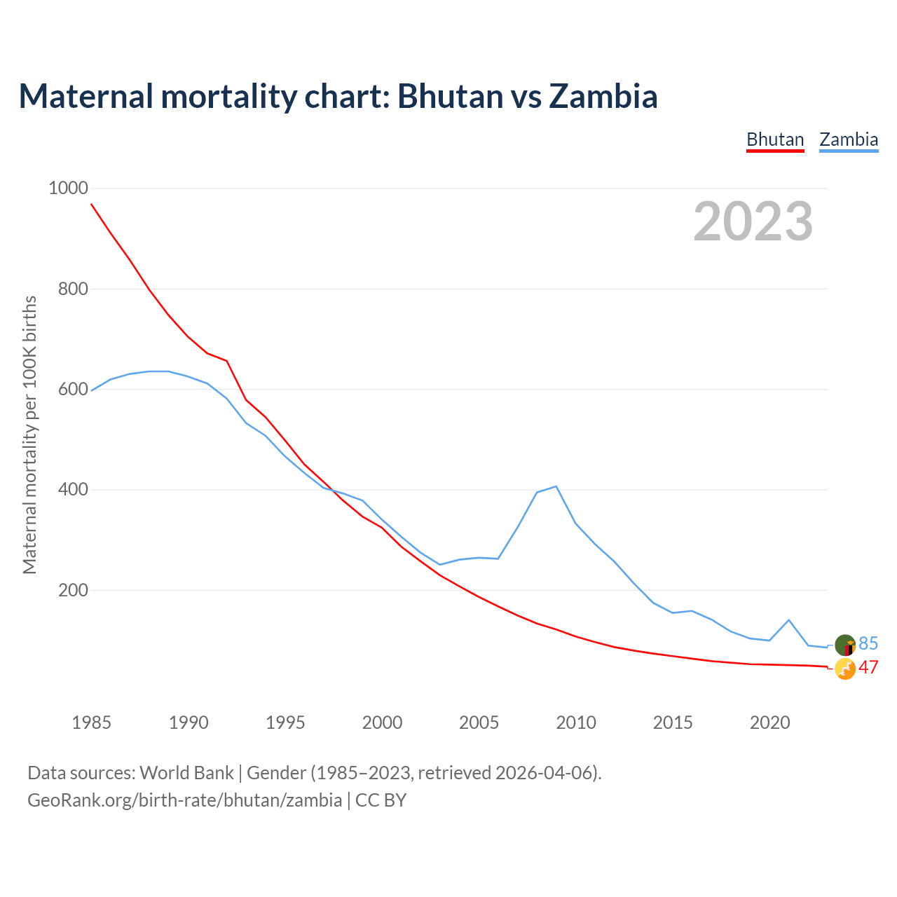 The maternal mortality rate, which is the probability of dying during childbirth or within 42 days of pregnancy termination, is 47 deaths per 100,000 live births in Bhutan, compared to 85 deaths in Zambia.