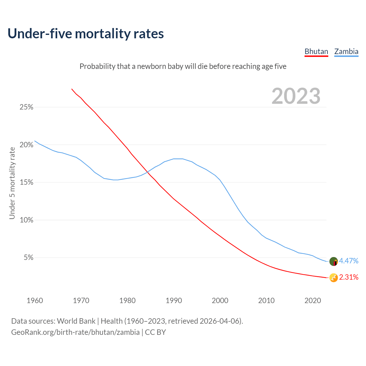 The chance that a newborn baby will die before reaching age five is 2.31% in Bhutan and 4.47% in Zambia. Above is a chart with historical data on under-five mortality rates.