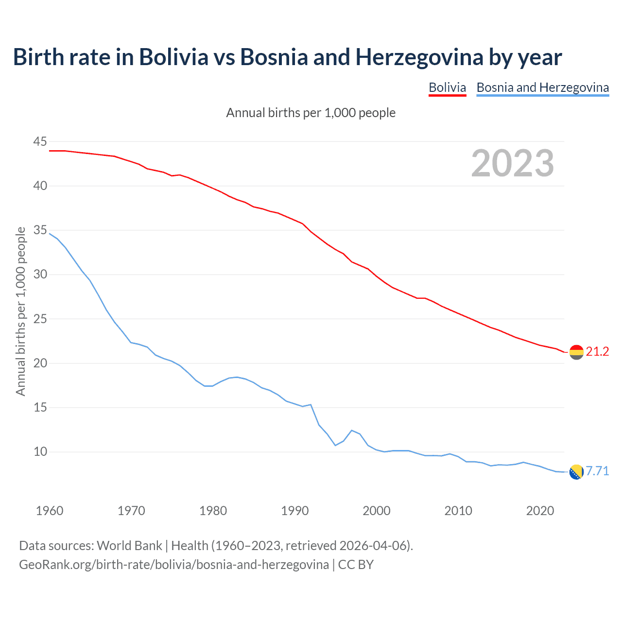 Bolivia has an annual birth rate of 21.2 births per 1,000 people, compared to 7.71 for Bosnia and Herzegovina. The average number of children a woman is expected to have during her lifetime — the fertility rate, is 2.55 in Bolivia and 1.49 in Bosnia and Herzegovina — 41.7% difference.