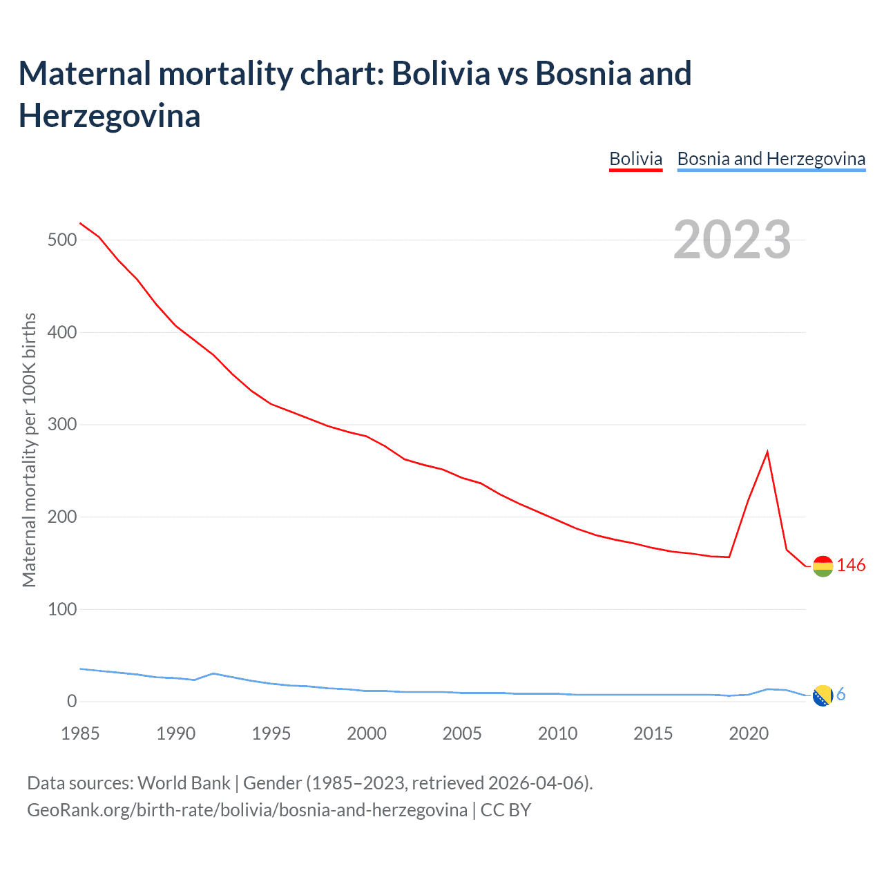 The maternal mortality rate, which is the probability of dying during childbirth or within 42 days of pregnancy termination, is 146 deaths per 100,000 live births in Bolivia, compared to 6 deaths in Bosnia and Herzegovina.