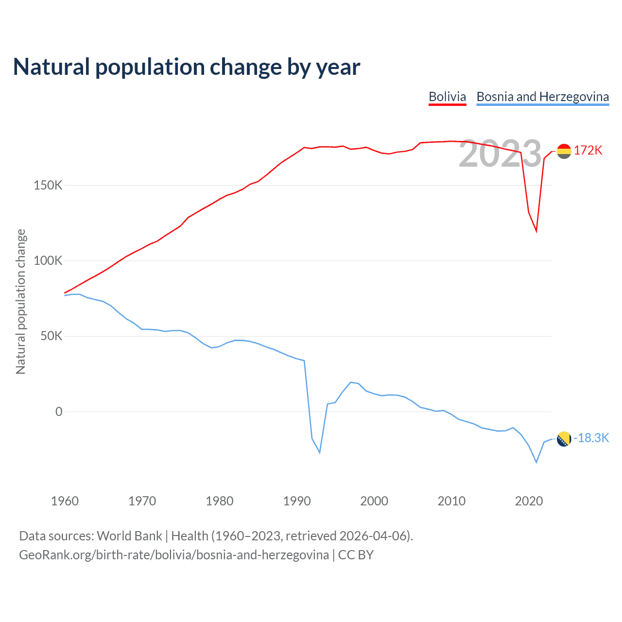 According to the latest available data on birth rates, the fertility rate in Bolivia was 2.55 children per woman in 2023, compared to 1.49 in Bosnia and Herzegovina in 2023. The replacement level is considered to be 2.1 children per woman.