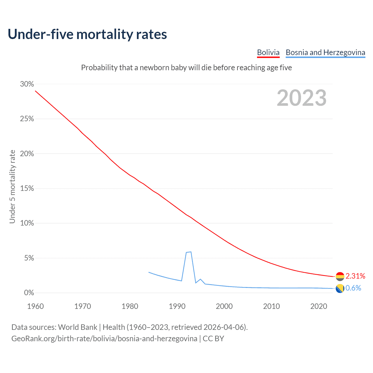 The chance that a newborn baby will die before reaching age five is 2.31% in Bolivia and 0.6% in Bosnia and Herzegovina. Above is a chart with historical data on under-five mortality rates.