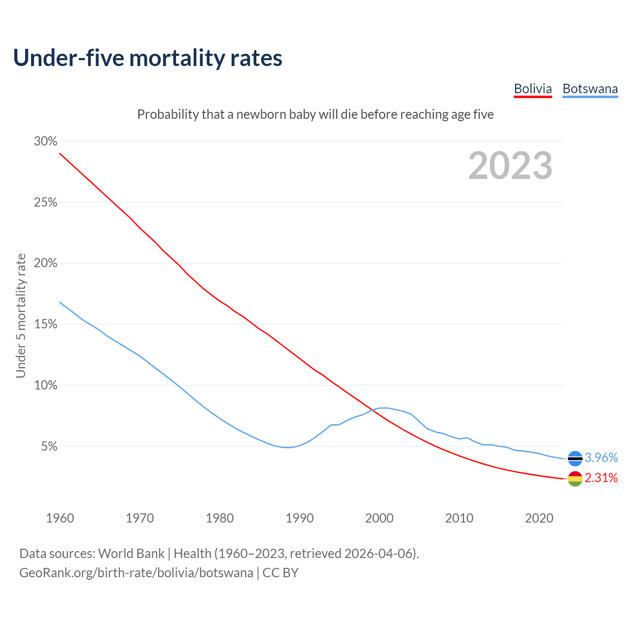 The chance that a newborn baby will die before reaching age five is 2.31% in Bolivia and 3.96% in Botswana. Above is a chart with historical data on under-five mortality rates.