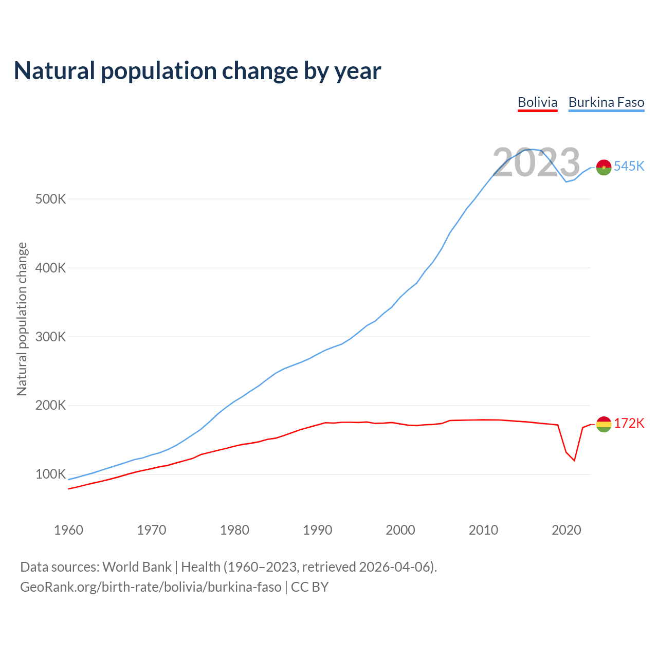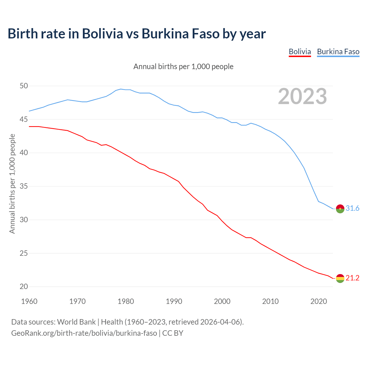 Bolivia has an annual birth rate of 21.2 births per 1,000 people, compared to 31.6 for Burkina Faso. The average number of children a woman is expected to have during her lifetime — the fertility rate, is 2.55 in Bolivia and 4.19 in Burkina Faso — 64.4% difference.