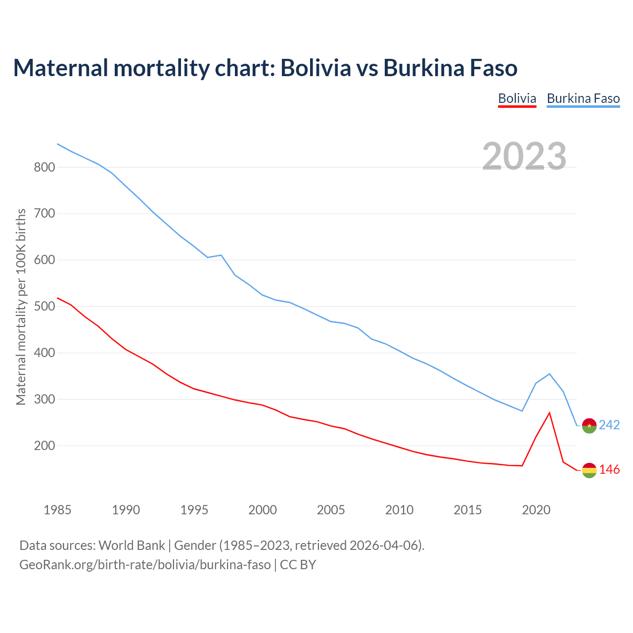 The maternal mortality rate, which is the probability of dying during childbirth or within 42 days of pregnancy termination, is 146 deaths per 100,000 live births in Bolivia, compared to 242 deaths in Burkina Faso.