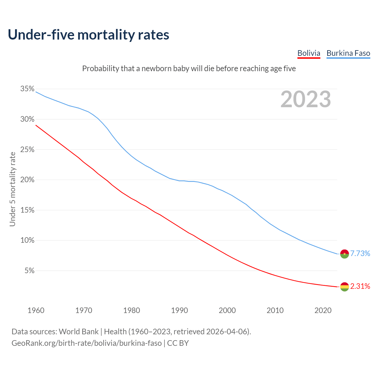 The chance that a newborn baby will die before reaching age five is 2.31% in Bolivia and 7.73% in Burkina Faso. Above is a chart with historical data on under-five mortality rates.