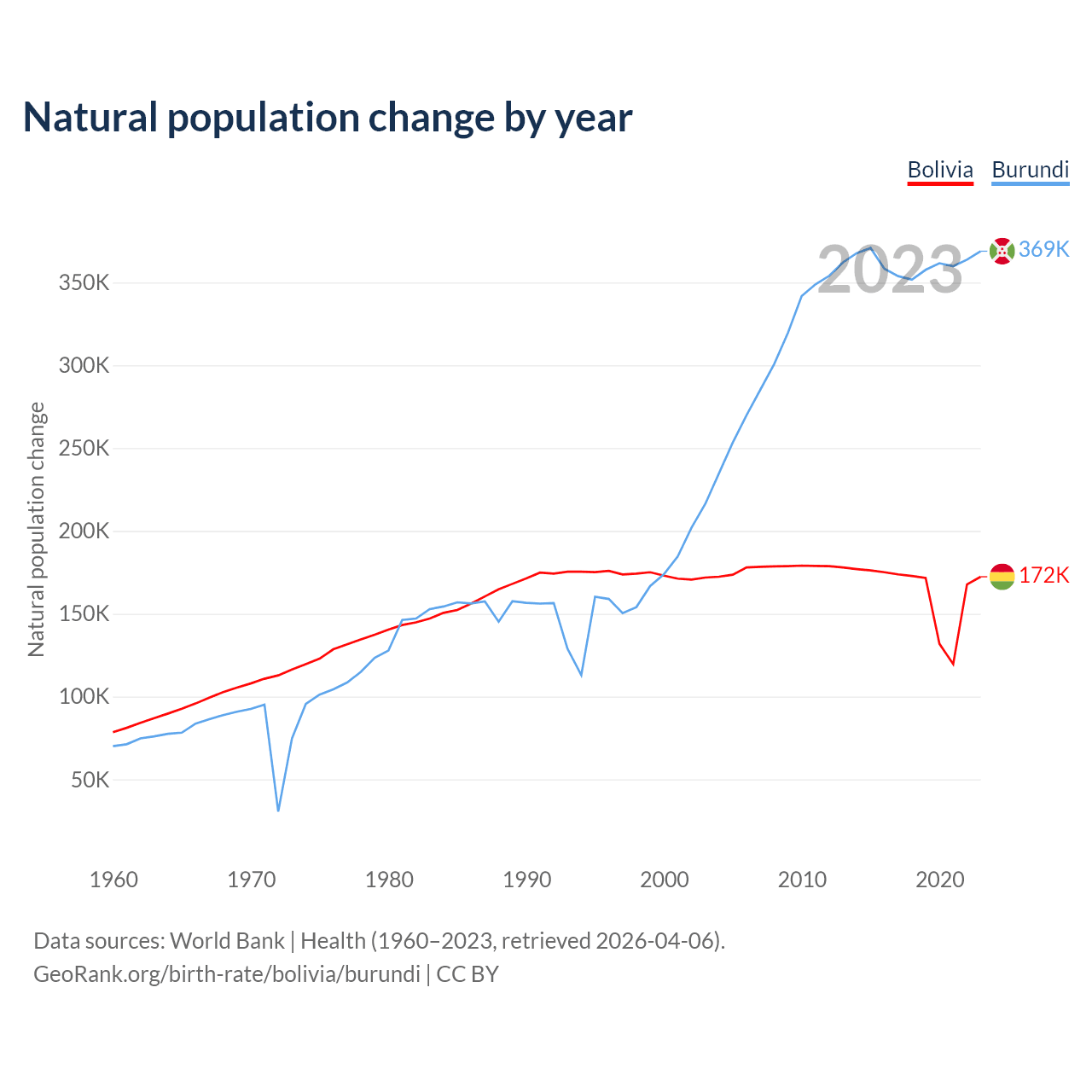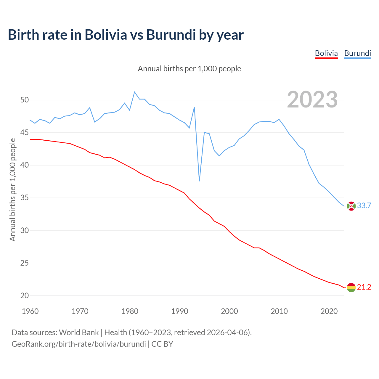 Bolivia has an annual birth rate of 21.2 births per 1,000 people, compared to 33.7 for Burundi. The average number of children a woman is expected to have during her lifetime — the fertility rate, is 2.55 in Bolivia and 4.88 in Burundi — 91.5% difference.