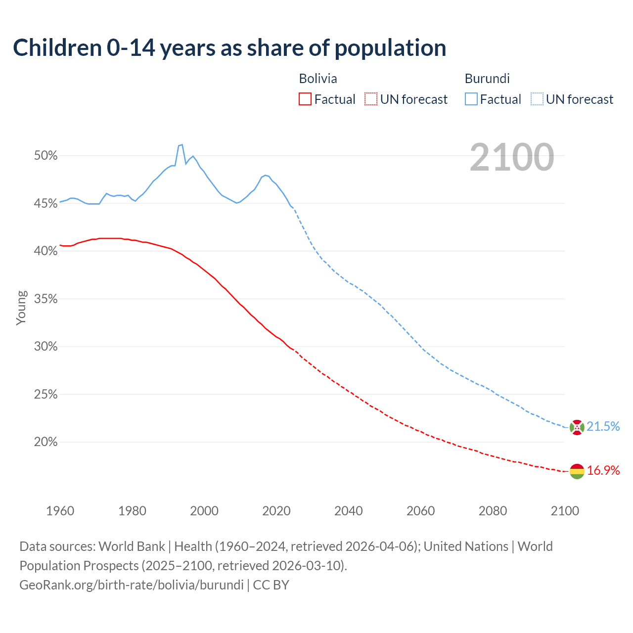 According to the latest available data on birth rates, the fertility rate in Bolivia was 2.55 children per woman in 2023, compared to 4.88 in Burundi in 2023. The replacement level is considered to be 2.1 children per woman.