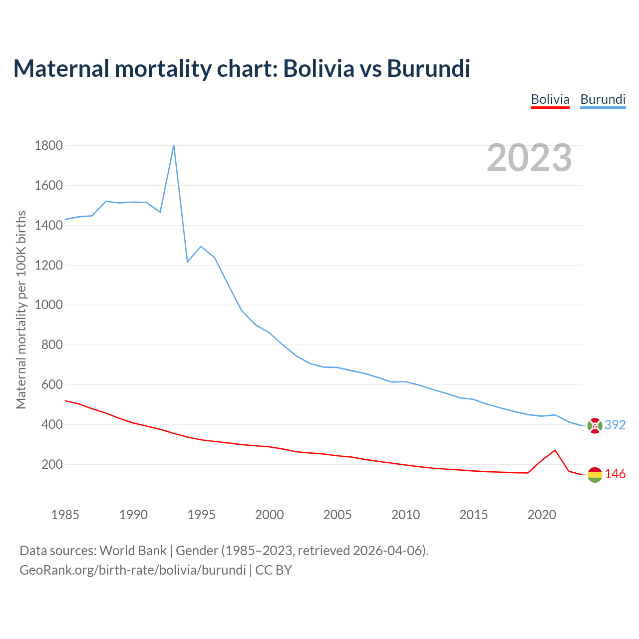 The maternal mortality rate, which is the probability of dying during childbirth or within 42 days of pregnancy termination, is 146 deaths per 100,000 live births in Bolivia, compared to 392 deaths in Burundi.