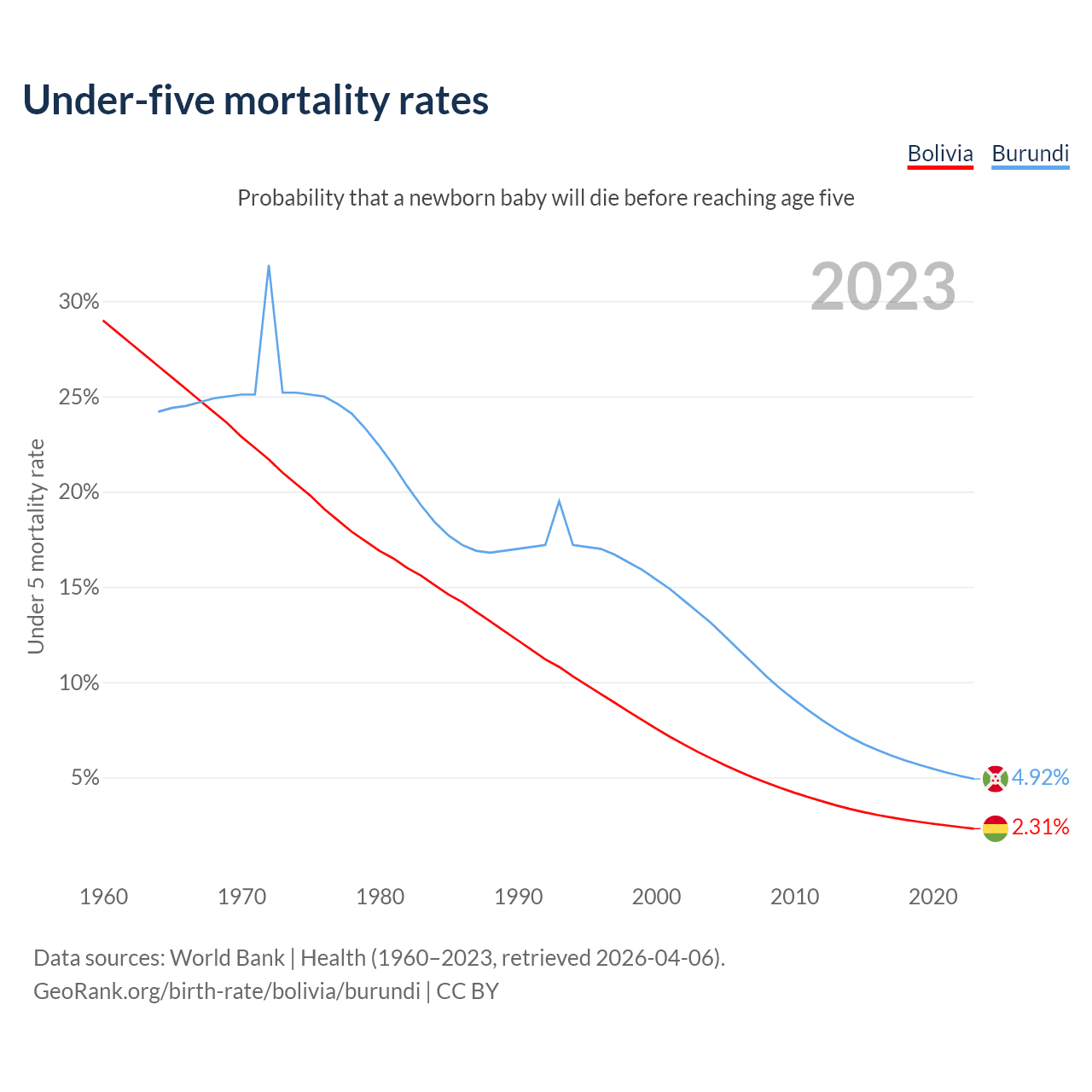The chance that a newborn baby will die before reaching age five is 2.31% in Bolivia and 4.92% in Burundi. Above is a chart with historical data on under-five mortality rates.