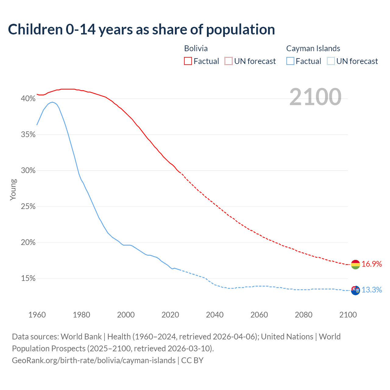 Data sources: World Bank | Health (1960–2024, retrieved 2026-04-06); United Nations | World Population Prospects (2025–2100, retrieved 2026-03-10).