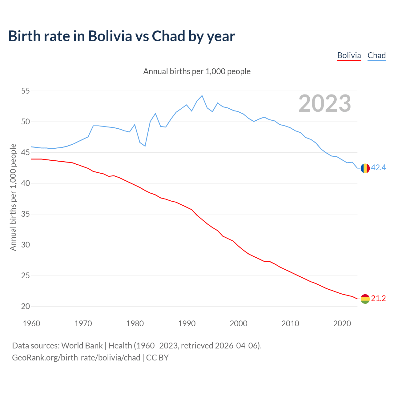 According to the latest available data on birth rates, the fertility rate in Bolivia was 2.55 children per woman in 2023, compared to 6.12 in Chad in 2023. The replacement level is considered to be 2.1 children per woman.