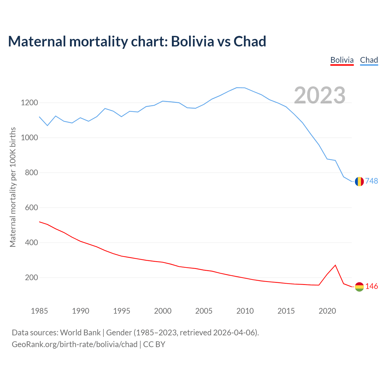 The maternal mortality rate, which is the probability of dying during childbirth or within 42 days of pregnancy termination, is 146 deaths per 100,000 live births in Bolivia, compared to 748 deaths in Chad.