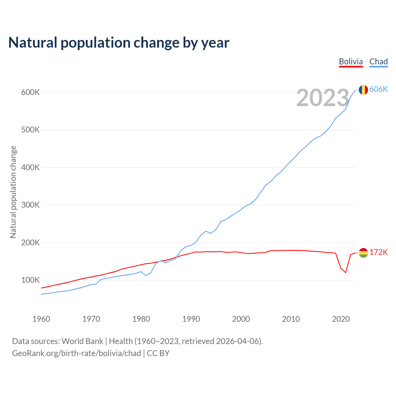 Bolivia has an annual birth rate of 21.2 births per 1,000 people, compared to 42.4 for Chad. The average number of children a woman is expected to have during her lifetime — the fertility rate, is 2.55 in Bolivia and 6.12 in Chad — 140.3% difference.