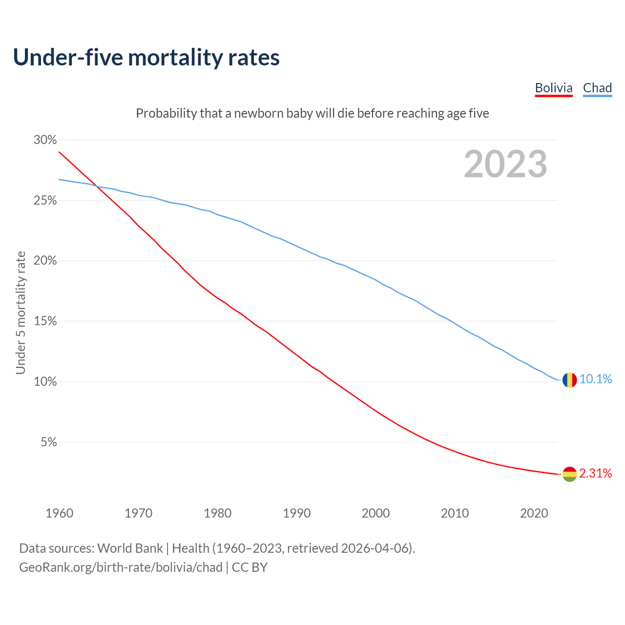 The chance that a newborn baby will die before reaching age five is 2.31% in Bolivia and 10.1% in Chad. Above is a chart with historical data on under-five mortality rates.