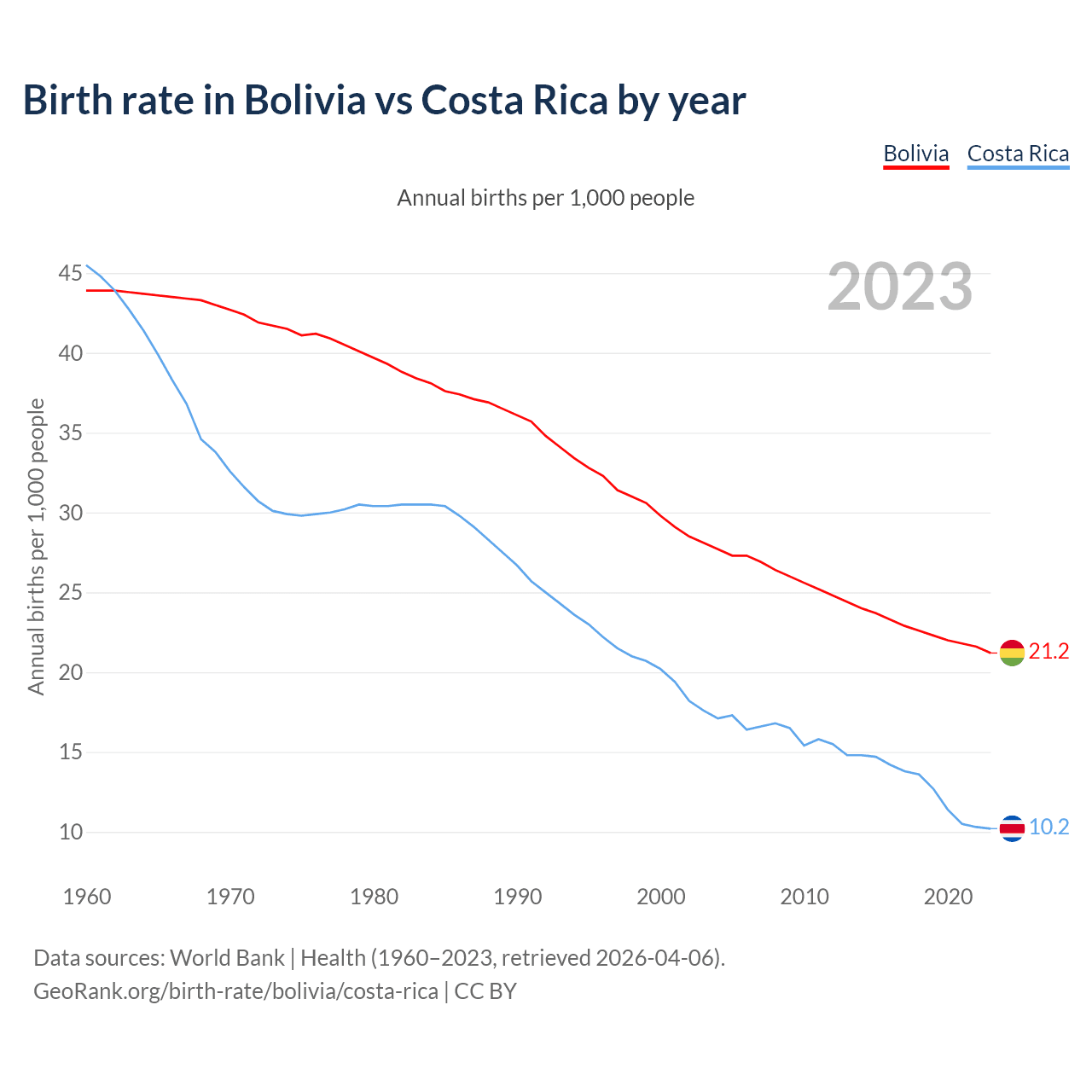 Bolivia has an annual birth rate of 21.2 births per 1,000 people, compared to 10.2 for Costa Rica. The average number of children a woman is expected to have during her lifetime — the fertility rate, is 2.55 in Bolivia and 1.33 in Costa Rica — 47.8% difference.