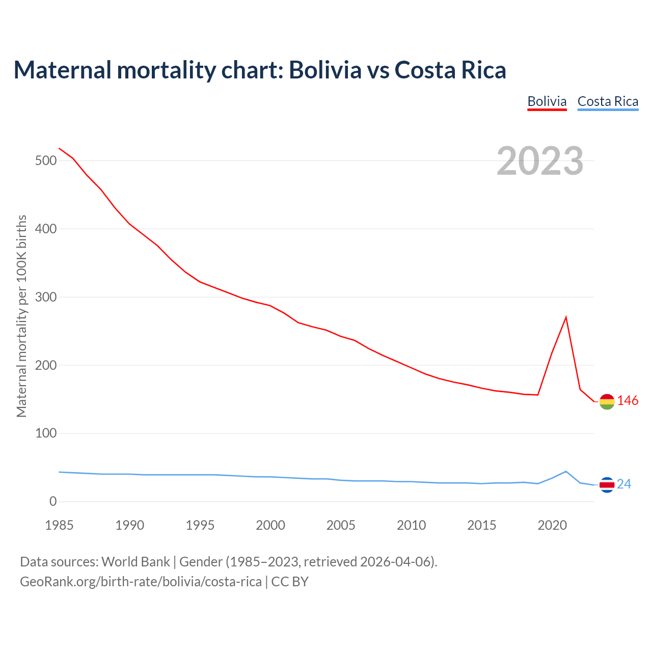 The maternal mortality rate, which is the probability of dying during childbirth or within 42 days of pregnancy termination, is 146 deaths per 100,000 live births in Bolivia, compared to 24 deaths in Costa Rica.