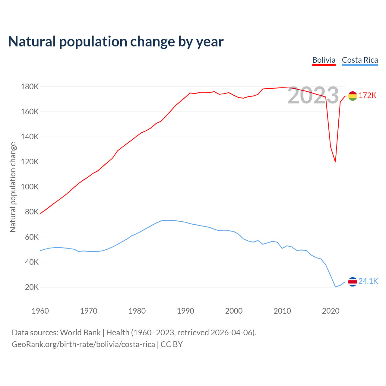 According to the latest available data on birth rates, the fertility rate in Bolivia was 2.55 children per woman in 2023, compared to 1.33 in Costa Rica in 2023. The replacement level is considered to be 2.1 children per woman.