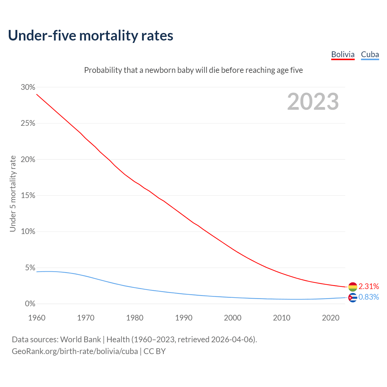 The chance that a newborn baby will die before reaching age five is 2.31% in Bolivia and 0.83% in Cuba. Above is a chart with historical data on under-five mortality rates.