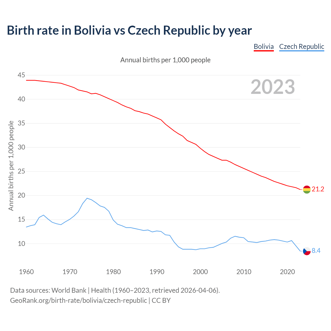 Bolivia has an annual birth rate of 21.2 births per 1,000 people, compared to 8.4 for the Czech Republic. The average number of children a woman is expected to have during her lifetime — the fertility rate, is 2.55 in Bolivia and 1.45 in the Czech Republic — 43.1% difference.
