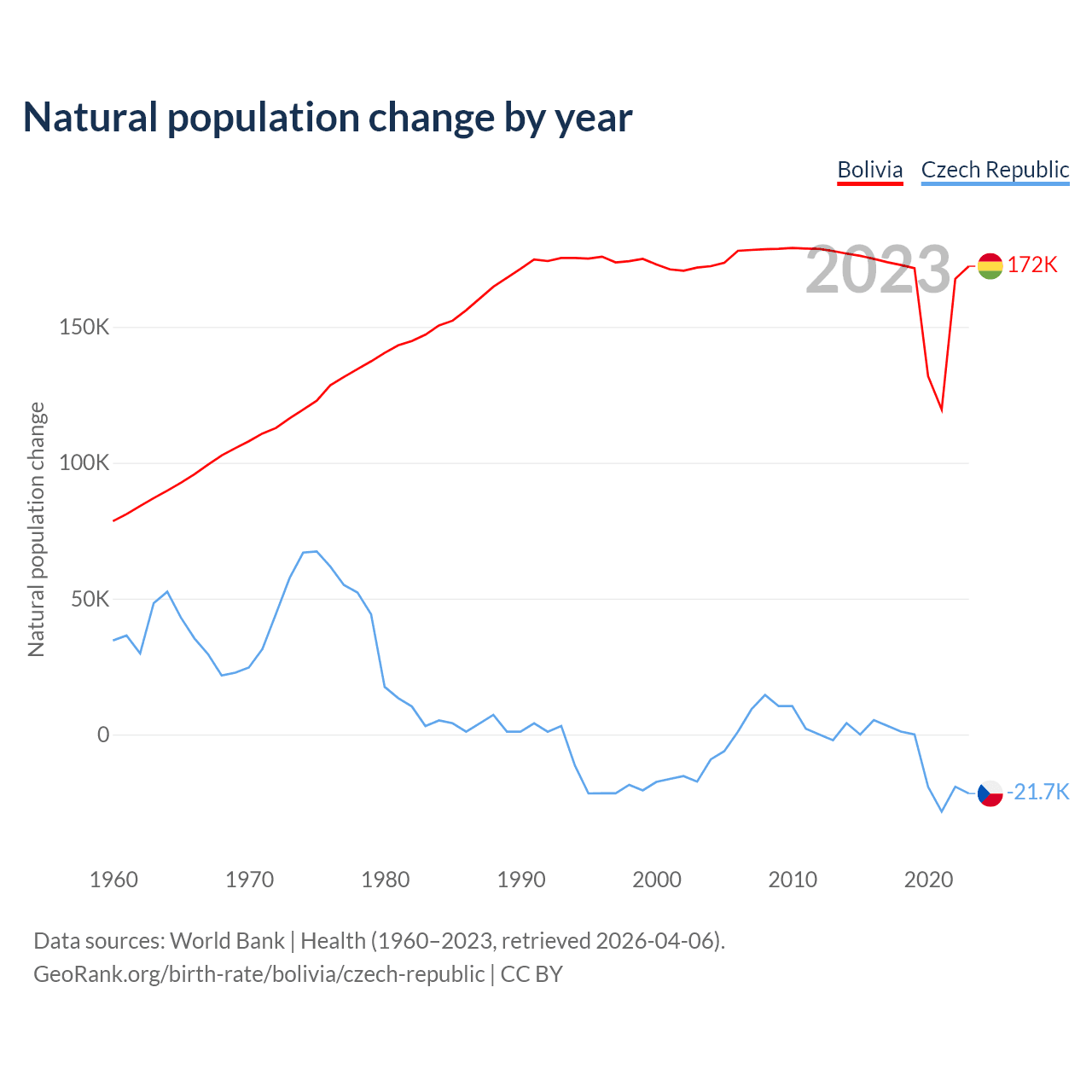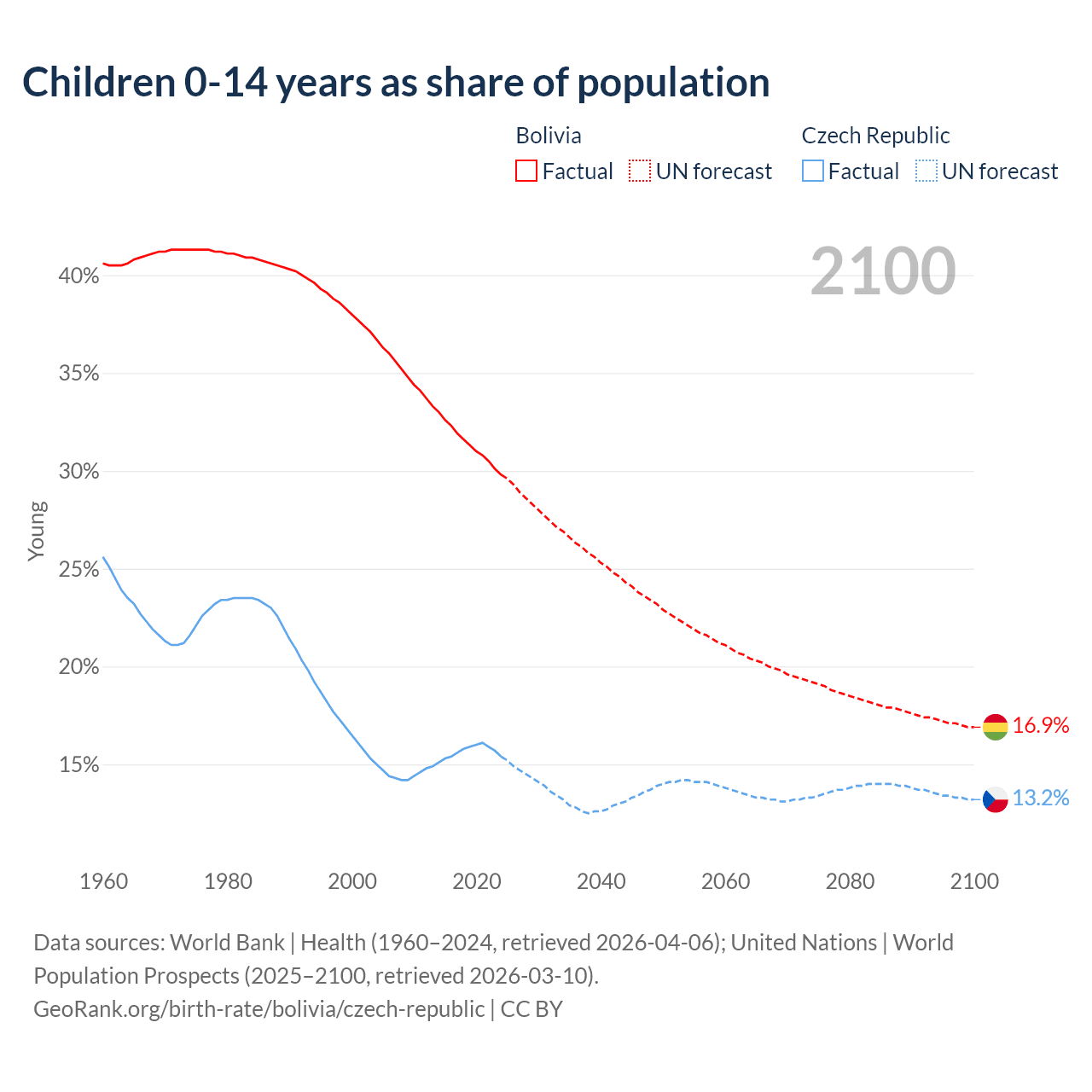 According to the latest available data on birth rates, the fertility rate in Bolivia was 2.55 children per woman in 2023, compared to 1.45 in the Czech Republic in 2023. The replacement level is considered to be 2.1 children per woman.